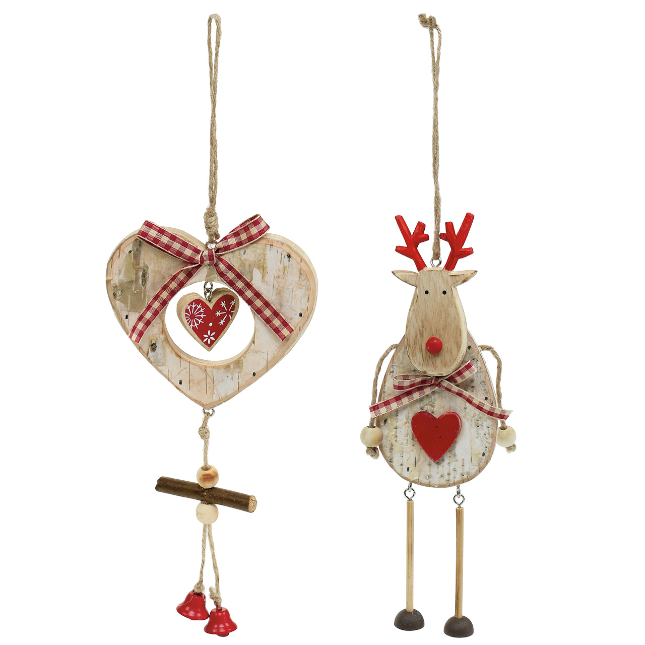Weihnachtszeit ist Dekorationszeit! Schaffen Sie ein festliches Ambiente mit den weihnachtlichen Herz- und Elchhängern von VIANA! Die beiden Hänger sind aus echtem Birkenholz gefertigt und individuell liebevoll gestaltet. So sind sie mit einem weiß-rot karierten Schleifenband versehen und haben eine Jute-Kordel zum Aufhängen. Der Elchhänger hat schwingende Arme und Beine, eine putzig rote Nase und ein Herz aus Holz auf seinem Bauch. An dem Herzhänger hängen zwei festliche Glöckchen aus Metall.