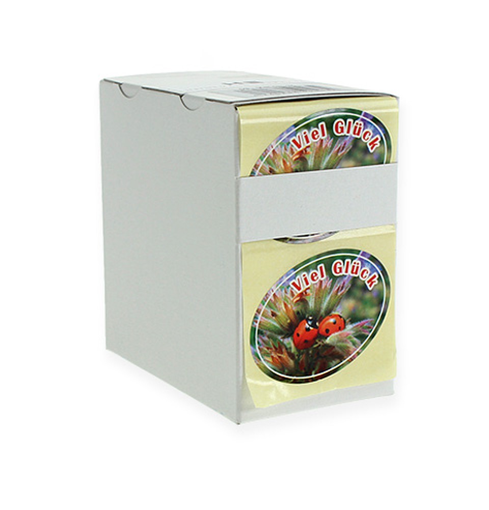 Enthalten sind die bunten Etiketten mit der Aufschrift „Viel Glück“ zu insgesamt 250 Stück in einer praktischen Pappbox, die auch als Spender fungiert. Platzieren Sie die Schachtel einfach auf der Verkaufstheke und ziehen bei Bedarf einen der etwa 5,5 x 4 Zentimeter großen Aufkleber ab.