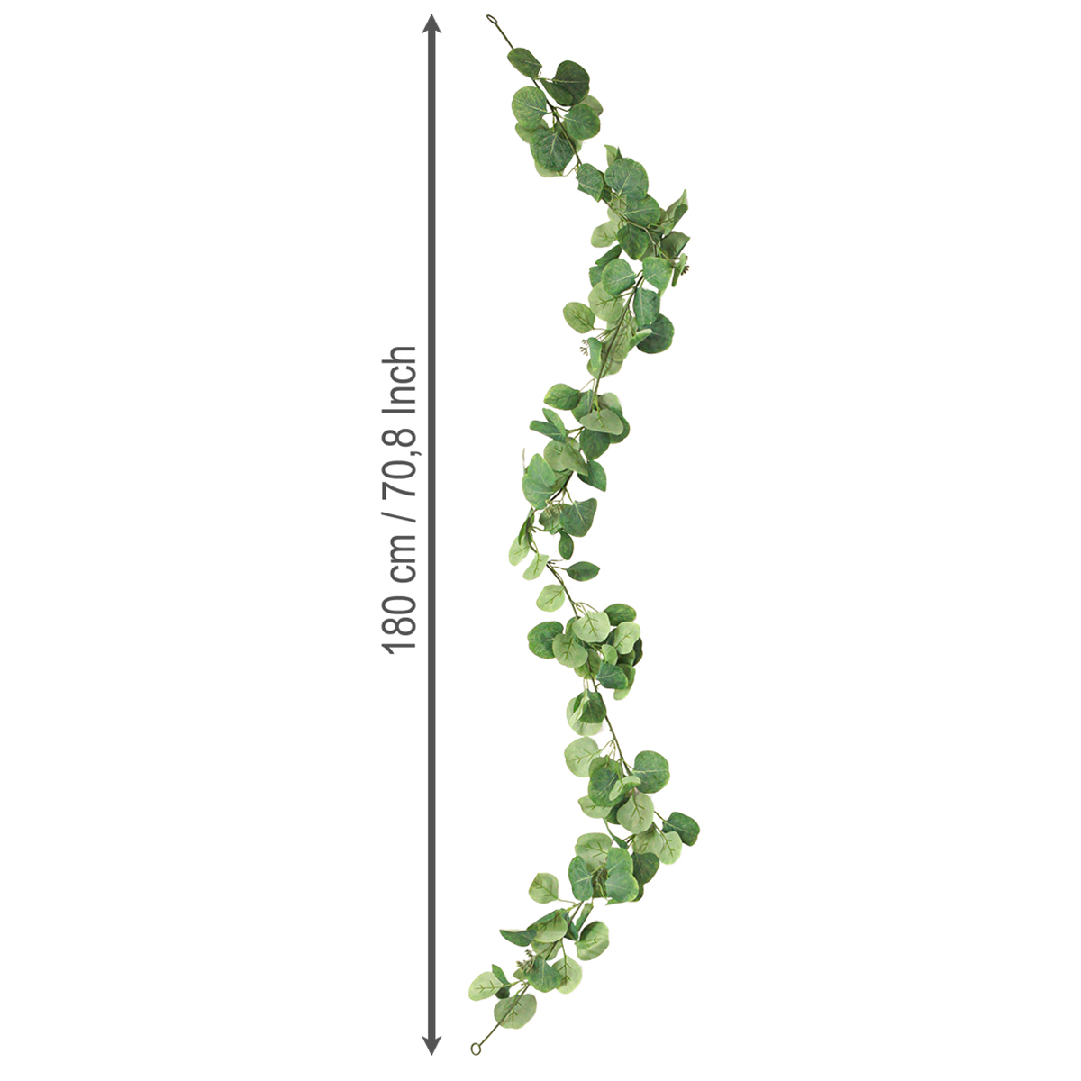 Verleihen Sie Ihren Räumen einen Hauch von natürlicher Schönheit mit unserem Eukalyptus als künstlicher grüner Blättergirlande. Diese kunstvoll gestaltete künstliche Eukalyptus-Blätter-Girlande bringt einen frischen, modernen Stil in jeden Raum. Die detailgetreue Nachbildung der Blätter des Eucalyptus globulus wird durch den Real-Touch-Effekt vervollständigt, der sie bemerkenswert echt erscheinen lässt. Diese künstliche Pflanzen-Girlande besticht durch ihre vielseitige Verwendbarkeit – ideal für Hochzeiten, Events oder als stilvolle Wohnraumdekoration. Die Kombination von lebendigem Grün und realistischer Optik macht sie als künstliche Deko-Girlande zum unverzichtbaren Accessoire für stilbewusste und kreative Köpfe.