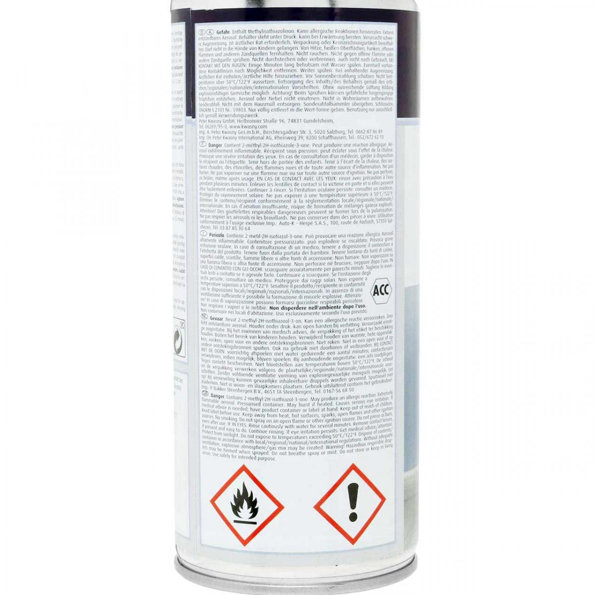 Inhaltsstoffe: Aceton, n-Butylacetat, 2-Metoxy-1-methylethylacetat, Propan, Butan, Isobutan, Ethanol, 2-Propanol, Titaniumdioxid, Xylen.