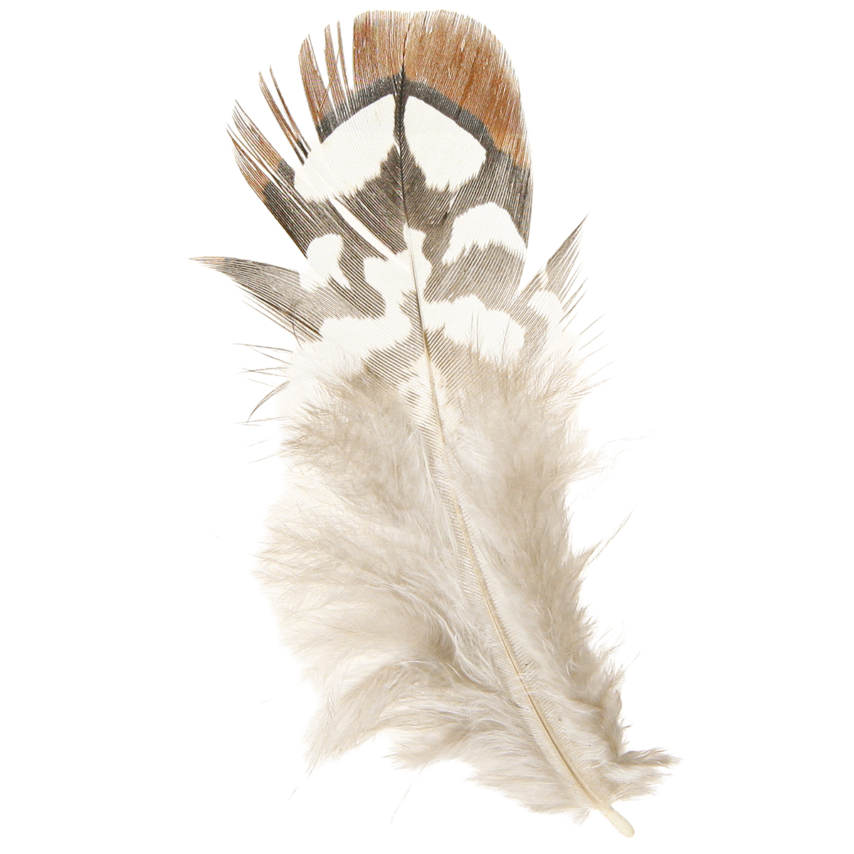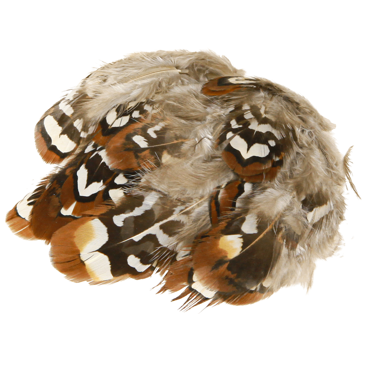 Die gefleckten Federn in Braun befinden sich in Tüte zu circa 60 Stück. Dies entspricht in etwa einem Nettogewicht von 45 Gramm.