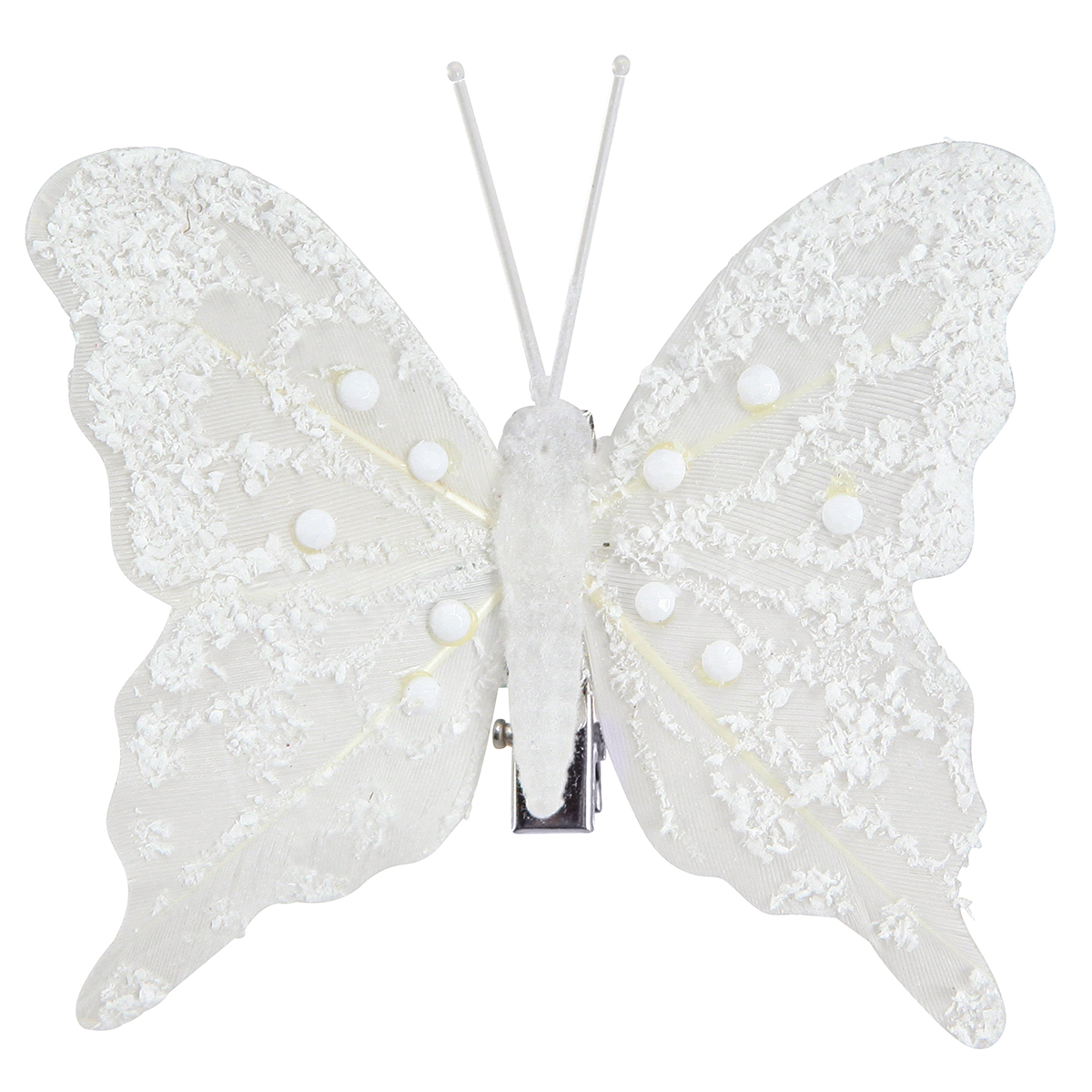 Verzaubern Sie Ihre Gestecke und Kränze mit dieser bezaubernden Schmetterling-Deko am Clip in strahlendem Weiß. Die zarten Flügel, verziert mit weißen Flocken und Perlen, bringen den Charme des Frühlings in Ihr Heim.