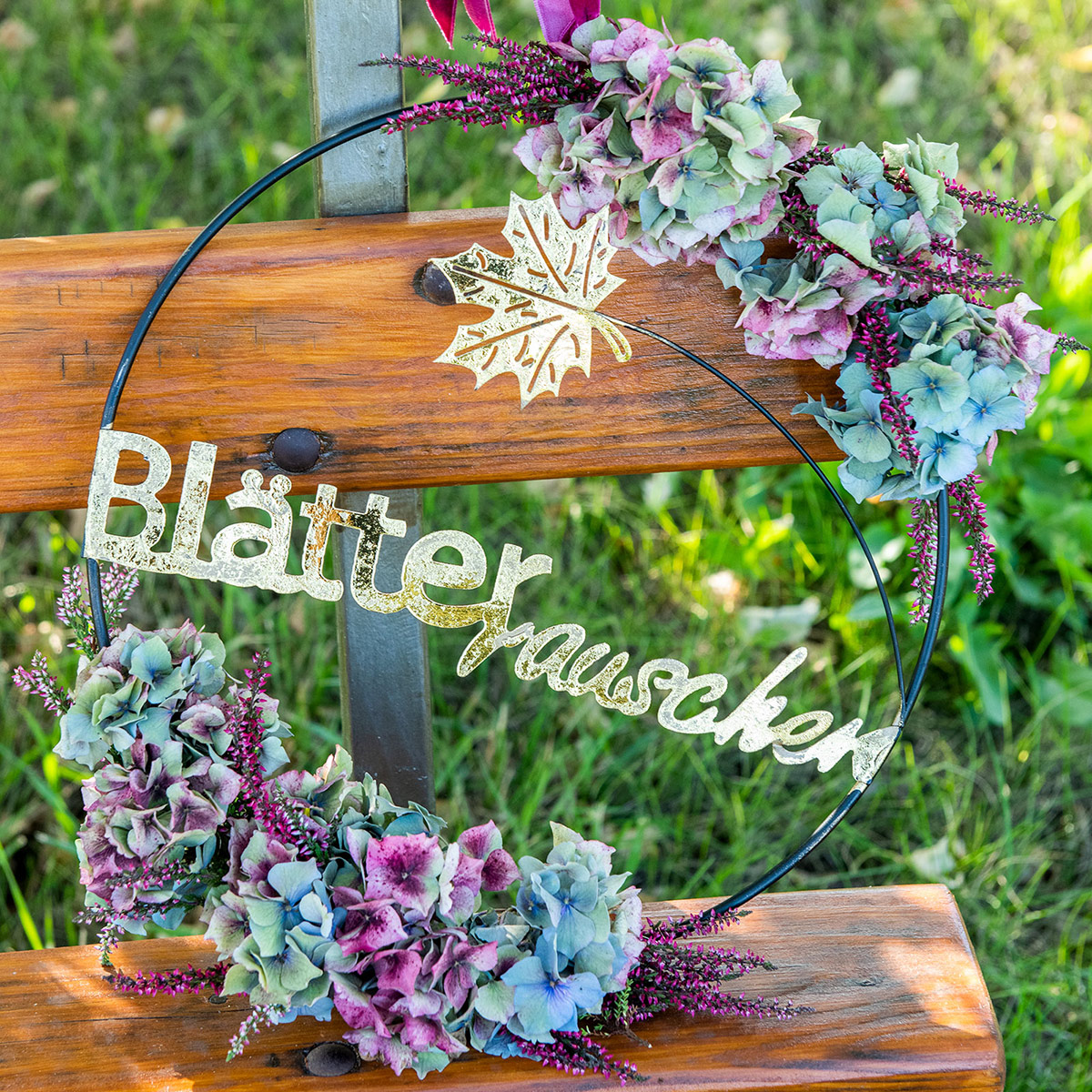 Sie können den flachen Metallring mit Schriftzug in seiner schlichten Schönheit nutzen, wie er ist. – Oder Sie verzieren die Metalldeko mit Blätterranke oder Trockenfloristik im angesagten Boho-Stil oder befestigen Sie auf einem Türkranz.