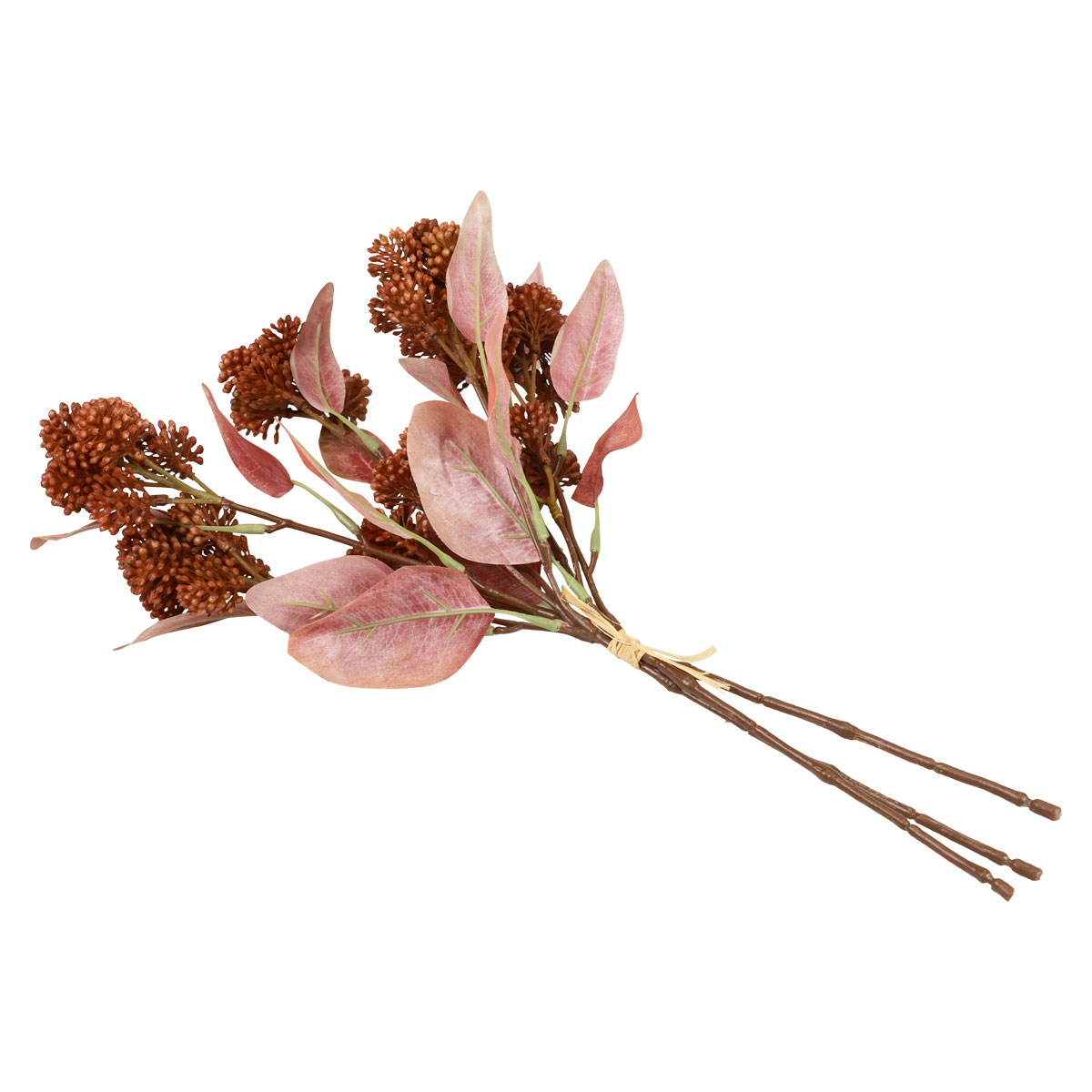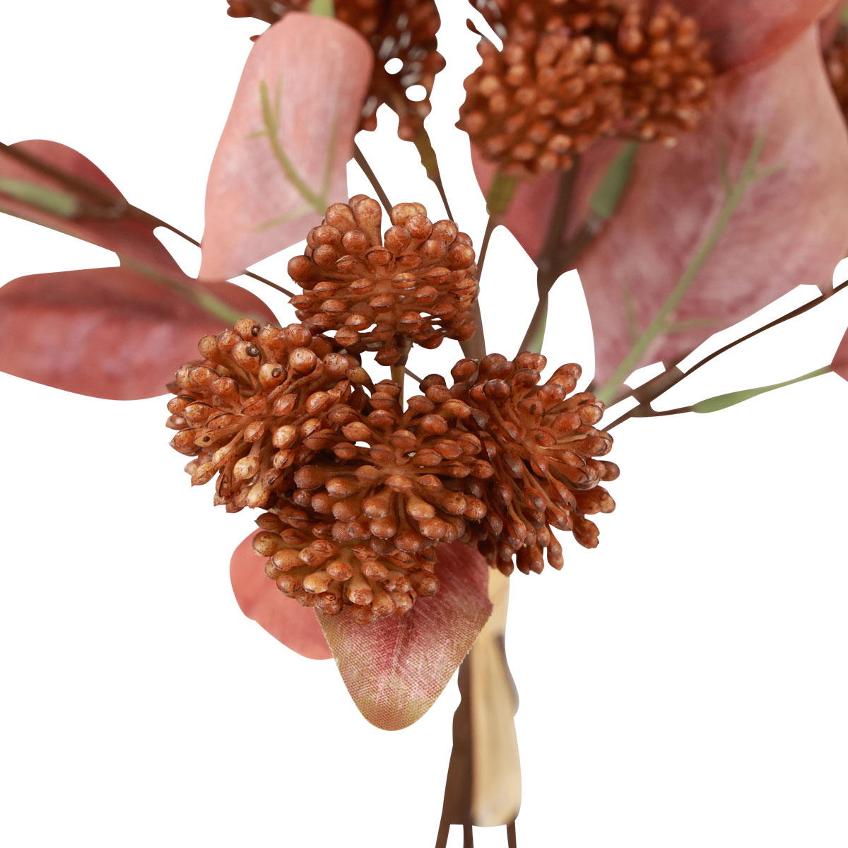 Die langen Stiele der Fetthenne verzweigen sich nach oben hin vielfach und sind reich an rispenartig kugelförmig blühenden Blütenköpfen in Rot, wodurch die künstliche Blume schöne Farbtupfer in die Herbstdeko bringt.