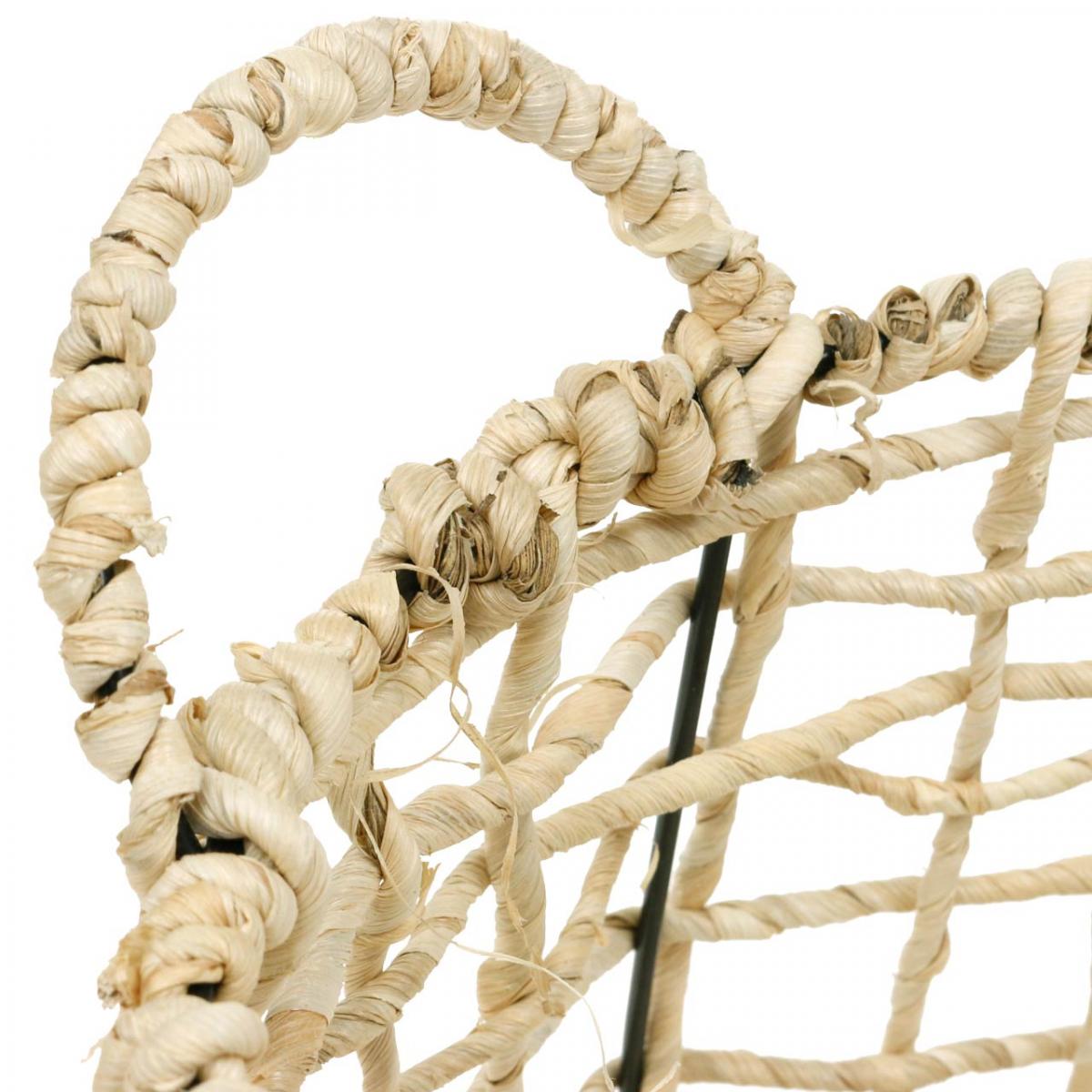 Der Korb ist auf einem Grundgerüst aus stabilem Metall in Schwarz gefertigt. Zwischen den Metallstreben ist Binsengras verflochten. Der oberen und unteren Rand des Flechtkorbs sowie seine Henkel sind vollständig mit der Schnur aus Seegras umwickelt.