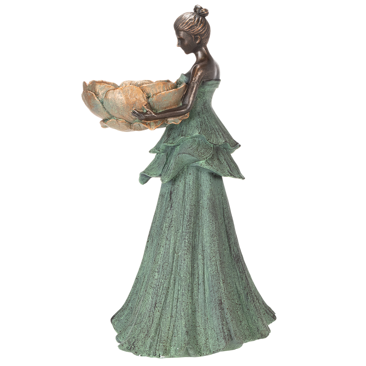 Die Blumenschale der Figur eignet sich perfekt, um Floristik-Kreationen, kleine Pflanzen oder dekorative Accessoires stilvoll in Szene zu setzen. Die Statue wirkt allein ebenso bezaubernd wie als Teil eines dekorativen Arrangements. Das robusten Polyresin garantiert Langlebigkeit, sodass sie sowohl drinnen als auch draußen der Witterung trotzt. Eine Kombination aus Funktionalität und Schönheit – wie gemacht, um jede Räumlichkeit mit Charme zu erfüllen.