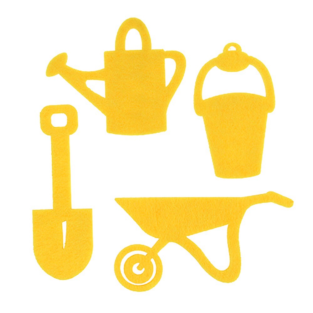 Die Gartengeräte aus Filz in Gelb werden zu insgesamt 24 Stück in einem Plastikbeutel geliefert. Jede Figur ist dabei 6-mal vorhanden. Die Gießkanne hat ungefähr eine Größe von 7,5 Zentimeter und der Eimer eine von circa 9 Zentimetern, während der Spaten und die Schubkarre jeweils etwa 12 Zentimeter groß sind.