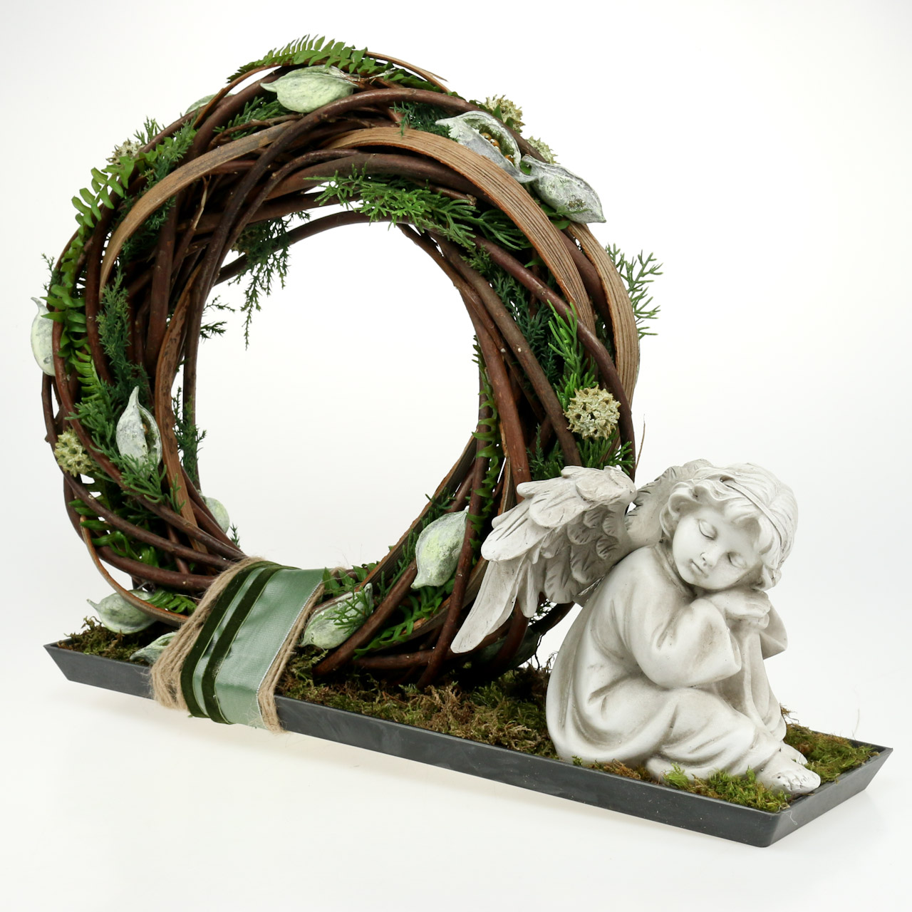 Die Deko Figur in Gestalt des sitzenden Engels ist ein wunderschönes Element für die Trauerfloristik. Sein Aussehen ist sehr stilvoll gestaltet: Von den geschlossenen Lidern über die realistisch wirkende Frisur bis zum Federkleid der Flügel lassen sich sehr viele schöne Details ausmachen