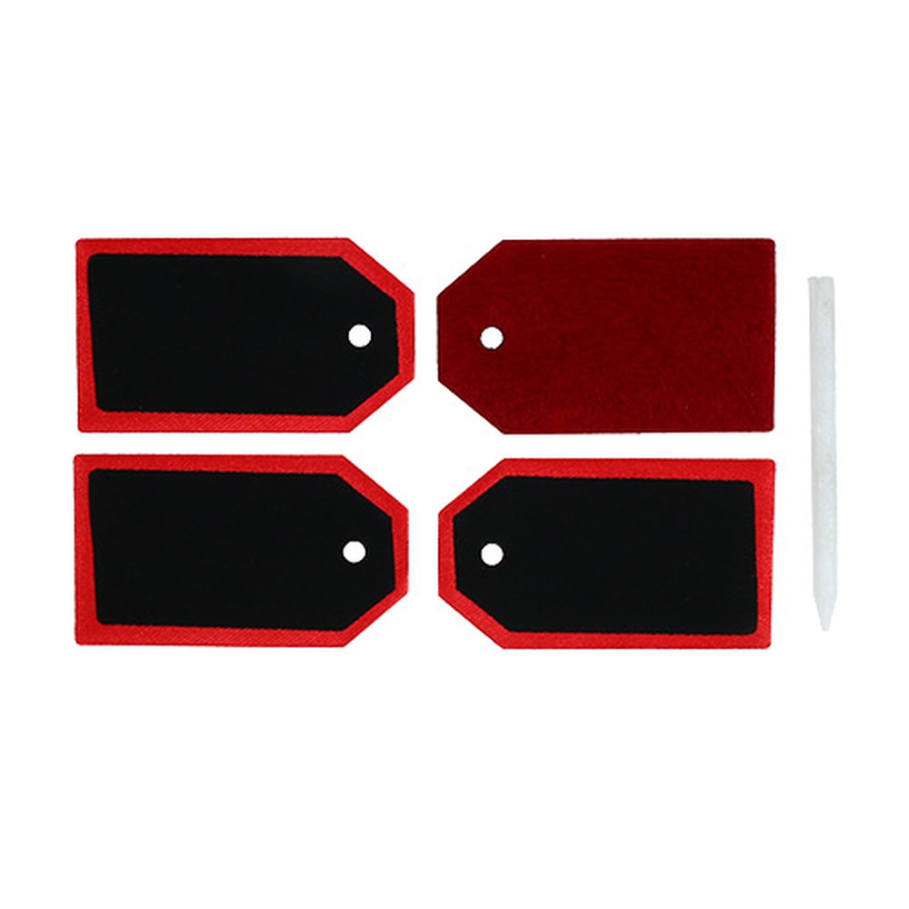 Die 18 Geschenkanhänger mit Tafelstift befinden sich einem Beutel und sind alle gleich gearbeitet. Ihre Maße betragen circa 8 x 4,5 Zentimeter und die Tafelhänger bestehen aus rotem Filz sowie Seidenstoff. Das Schriftfeld besteht aus schwarzem Stoff, der ähnlich wie eine Schiefertafel beschrieben werden kann und doch flexibel ist. Der beigelegte Stift besteht aus hochwertigem Kunstwachs, der mit weißer Farbe auf dem Feld malt.