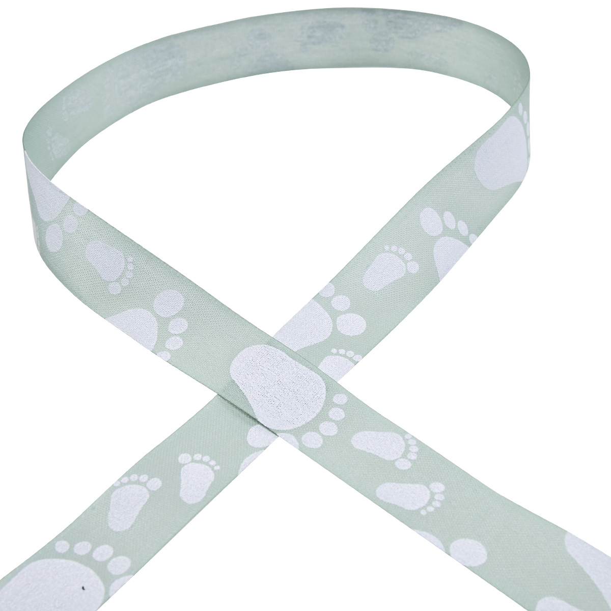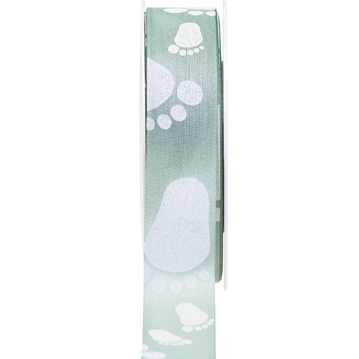 Den hellen, pastellgrünen Hintergrund des Stoffbandes zieren kleinere und größere Fußabdrücke. In Weiß bilden die Babyfüße einen schönen Kontrast zur Farbe des Dekobands und fangen gekonnt die Thematik des frohen Ereignisses ein.