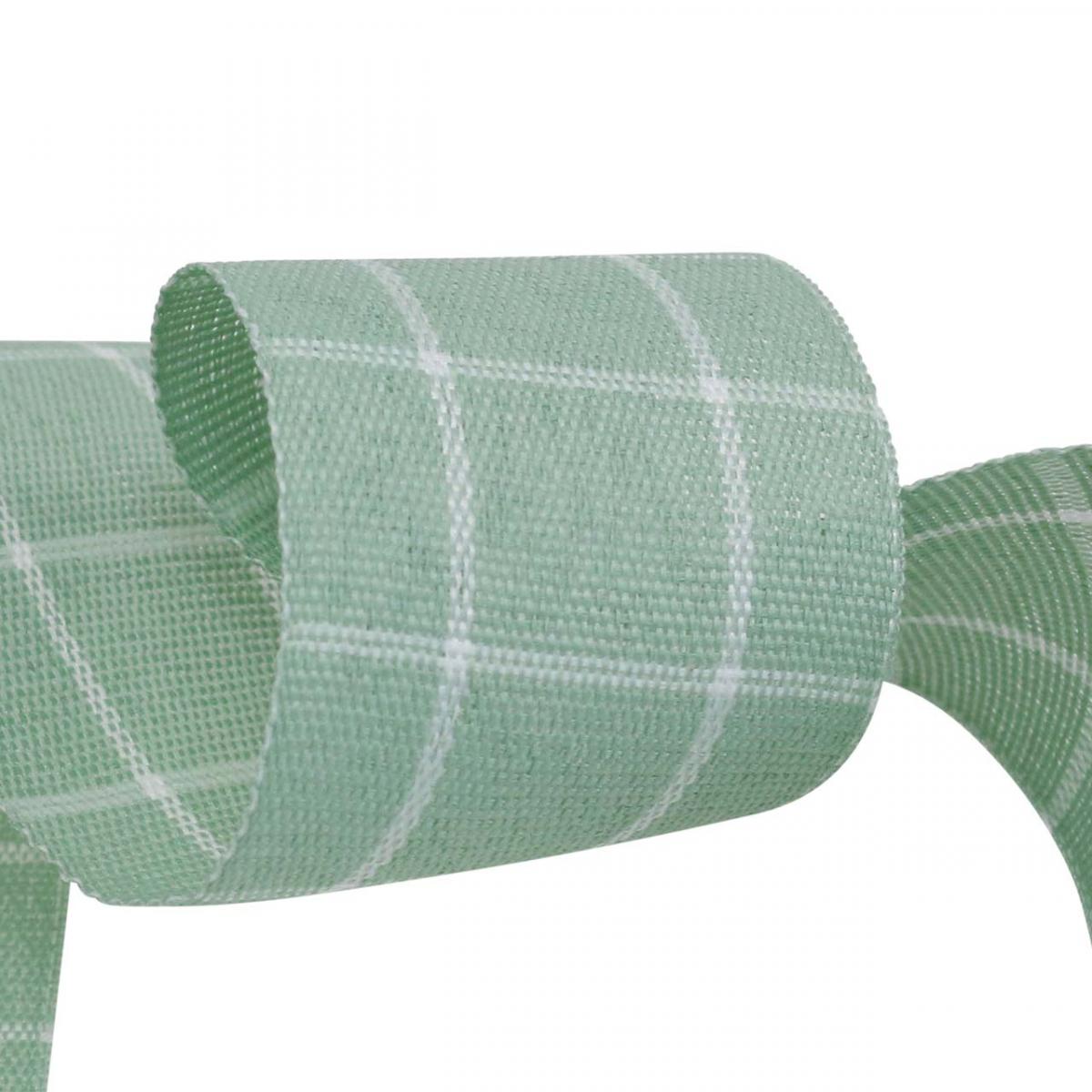 Das pastellgrüne, breite Dekoband ist mit einem weißen Karomuster verziert. Das Gewebe ist noch sichtbar, was dem Geschenkband einen leicht rustikalen Touch verleiht. Dennoch wirkt das Band durch seine dezente Farbe sehr exklusiv.