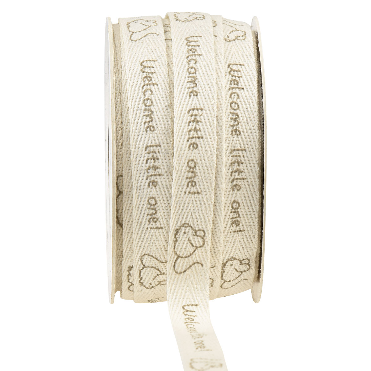Auf das cremefarbene Band aus reiner Baumwolle sind in hellem Braun neugierige Mäuse und der Gruß „Welcome little one!“ gedruckt. Das Dekoband aus dem Naturmaterial Baumwolle ist biologisch abbaubar und befindet sich für mehr Nachhaltigkeit auf einer Spule aus Karton. So kommt die Deko zur Taufe ganz ohne Kunststoff aus.