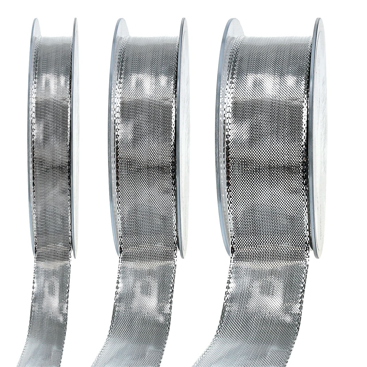 Von Tischdekorationen an Gestecken, Deko-Kränzen, Kerzenleuchtern und Vasen über einen Raumschmuck an Treppengeländern und Wandgirlanden bis hin zu Fensterdekorationen und sogar Näharbeiten ist mit den Dekobändern in Silber alles möglich! Da die Stoffbänder an den Rändern mit dünnem Metalldraht ausgestattet sind, können Sie neben Schleifen auch Spiralen, Wellen und Ringe daraus biegen, die dann ihre Form behalten. So entstehen zum Beispiel auch an Blumensträußen und -boxen schicke Eyecatcher, die Ihren Werkstücken das gewisse Etwas verleihen.