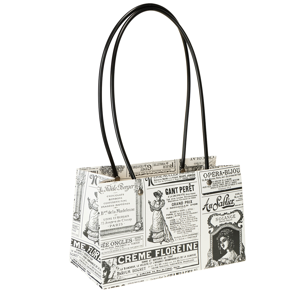 Das Design in Schwarzweiß mit den Werbeanzeigen für edle Pariser Kosmetik, Juweliere und Parfüms verleiht der Geschenktüte gleich eine besondere Aura, während die langen Griffe zusätzlich zu ihrer Eleganz sich beim Verpacken und Verschenken als praktisch erweisen.