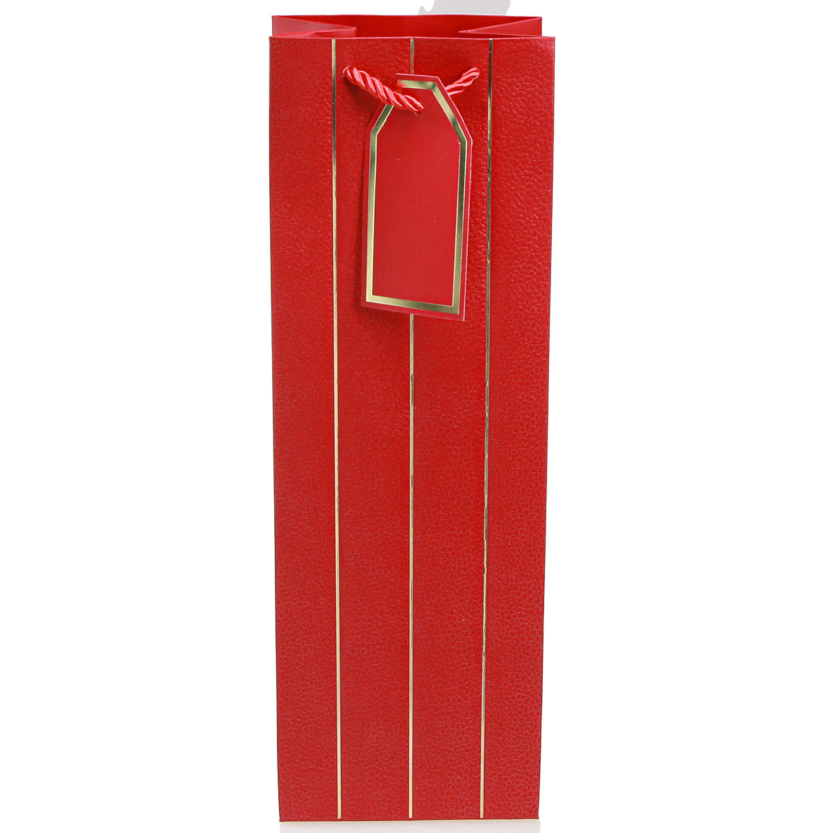 Die Flaschentüte ist rot, mit aufgeprägten goldenen Streifen und edler Lederoptik. Die Papiertüte hat einen verstärkten Boden, um Flaschen sicher transportieren zu können. Dazu kommt ein elegantes Etikett zum individuellen Beschriften. Zwei Schlaufen aus glänzendem rotem Band vervollständigen die Geschenktüten für Flaschen und machen Sie zur perfekten Geschenkverpackung.