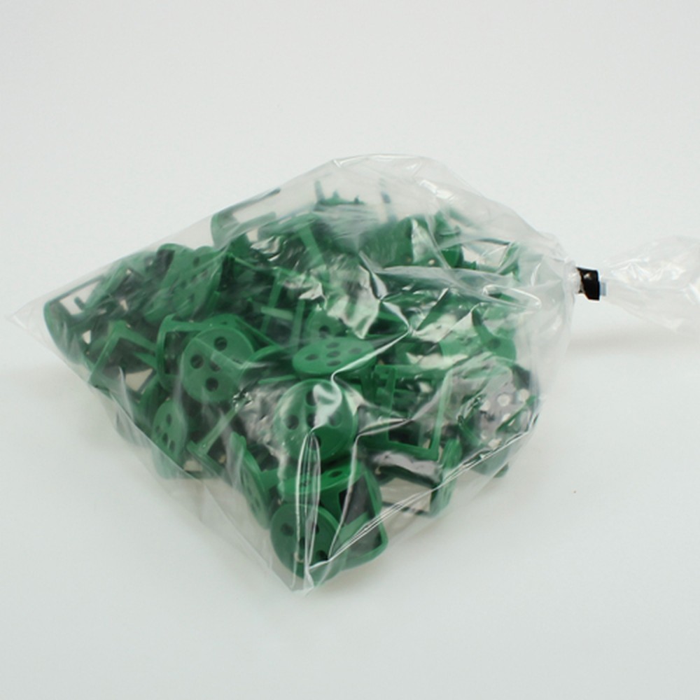 Die Gesteckhalter befinden sich in einem Beutel zu insgesamt 100 Stück. Jeder Stecker ist komplett in Grün gefärbt und besteht aus Kunststoff. Der Durchmesser sowie die Höhe betragen in etwa 3 Zentimeter.