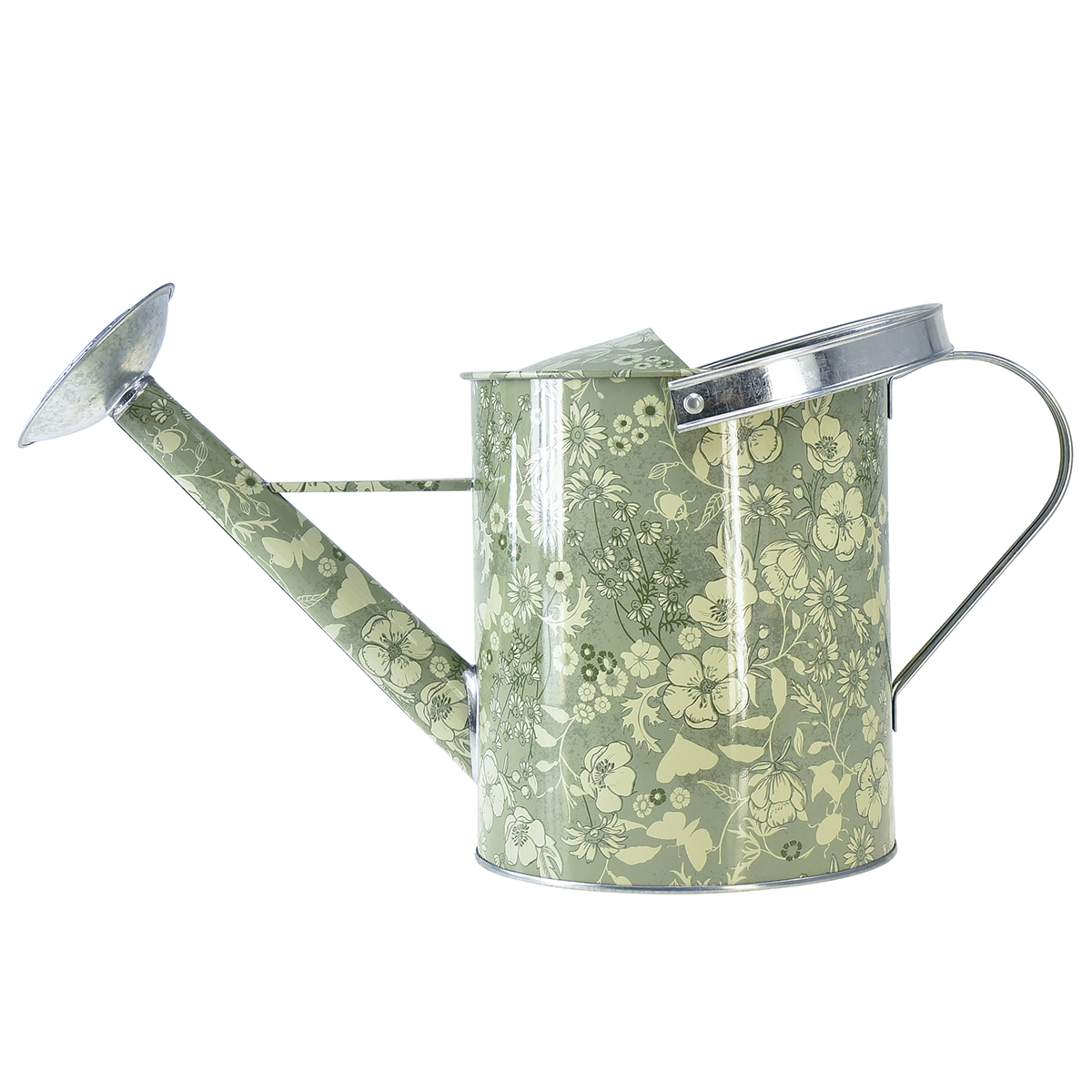 Zudem hat die hübsche Gießkanne eine breite Tülle, einen Griff und einen beweglichen Henkel. Diese sind wie das Innere der Kanne auch silbern gehalten. Die Kombination aus grünem Blumenmuster und den silbernen Elementen verleihen der Gießkannen-Deko einen charmanten Vintage-Look.