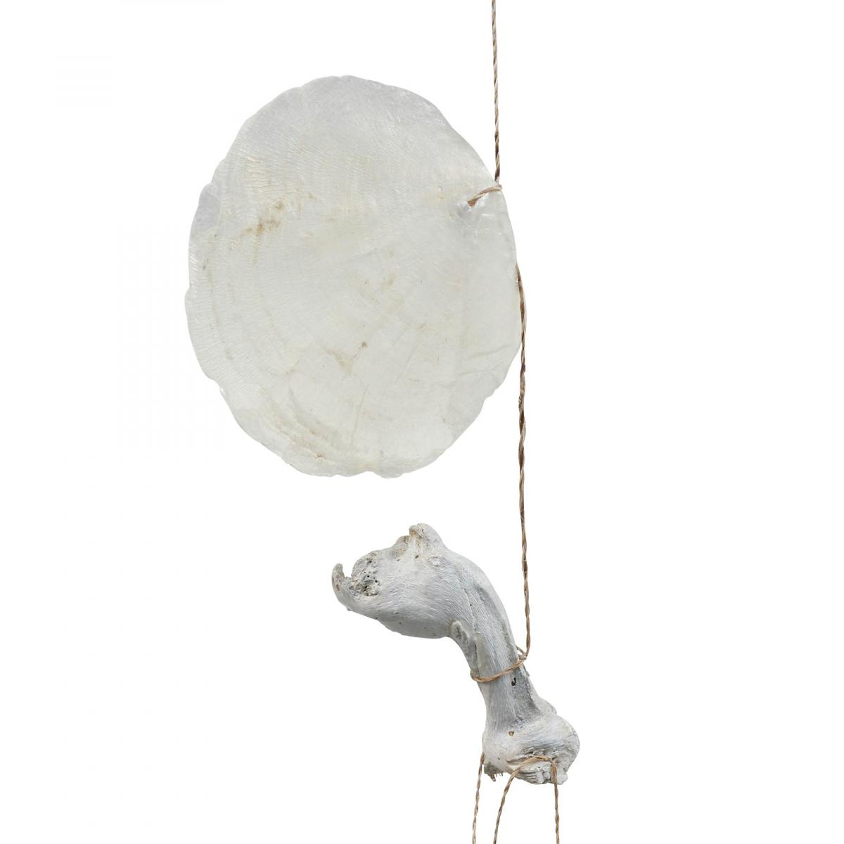 Sie erhalten einen Strang aus 5 Scheiben Perlmutt-Muscheln, die an einem durchbohrten Loch angeknotet sind und sich mit 4 Stück weiß gewaschenen Treibholz-Stücken abwechseln. Mit Schlaufe zum Aufhängen besitzt die Capiz-Girlande eine ungefähre Länge von 100 Zentimetern. Die Capiz-Muscheln besitzen eine Breite von 8 bis 9 Zentimetern.