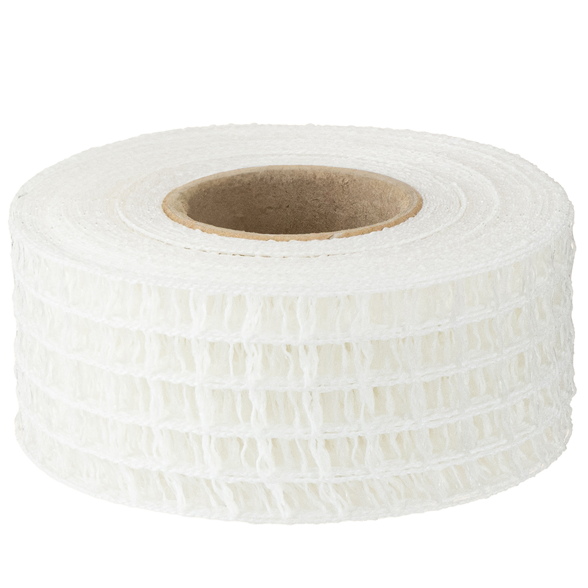 Das Gitterband in Weiß ist zu einer Rolle aufgewickelt und hat eine Länge von ungefähr 10 Metern und einer Breite von etwa 4,5 Zentimetern.