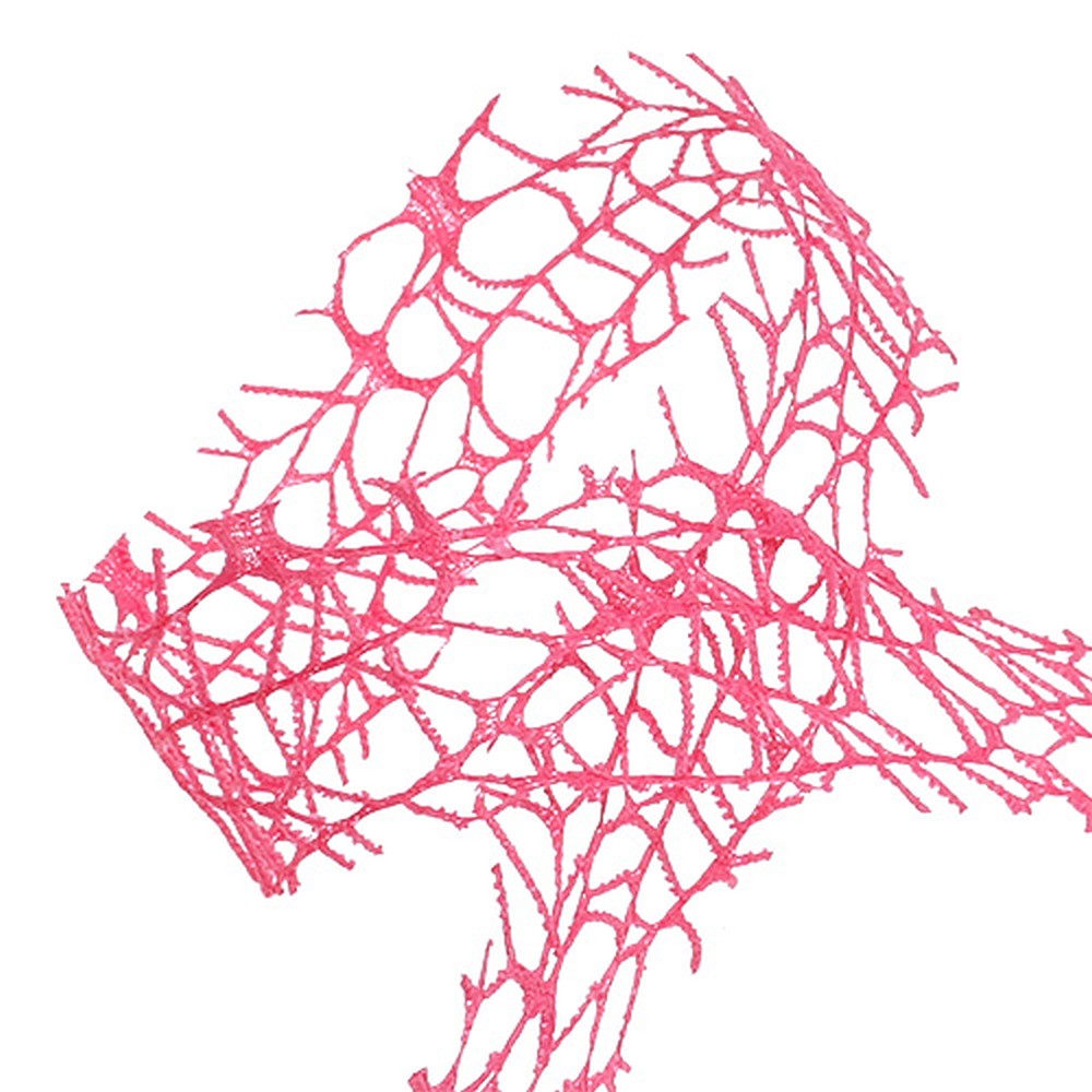 Das pinke Gitterband ist etwa 40 Millimeter breit und ungefähr 10 Meter lang. Es besteht zu 100% aus Polyester und ist auf einer Spule aus Kunststoff und Plastik aufgewickelt.