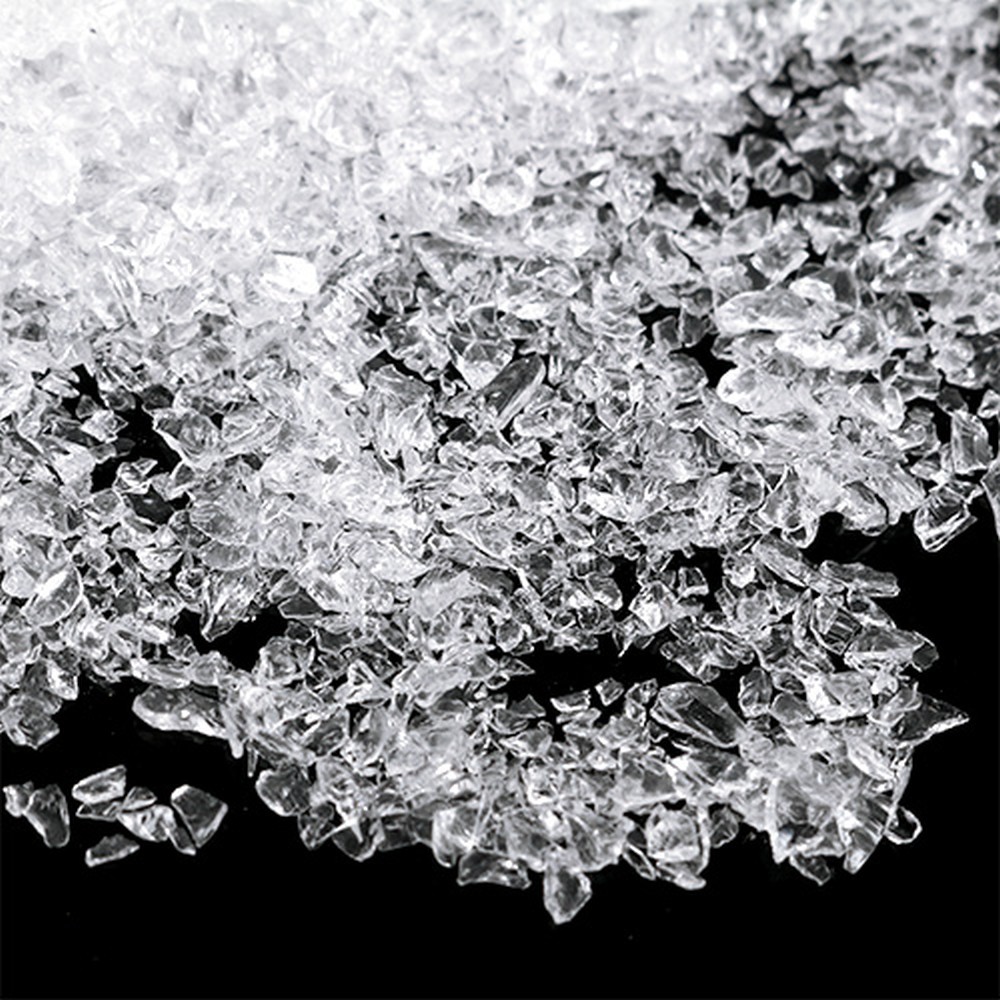 Die Glassteine in ihrer transparenten Naturfarbe werden in einem Beutel zu insgesamt 2 Kilogramm geliefert. Die einzelnen Steinchen können dabei circa zwischen 1 und 2 Millimeter groß werden.
