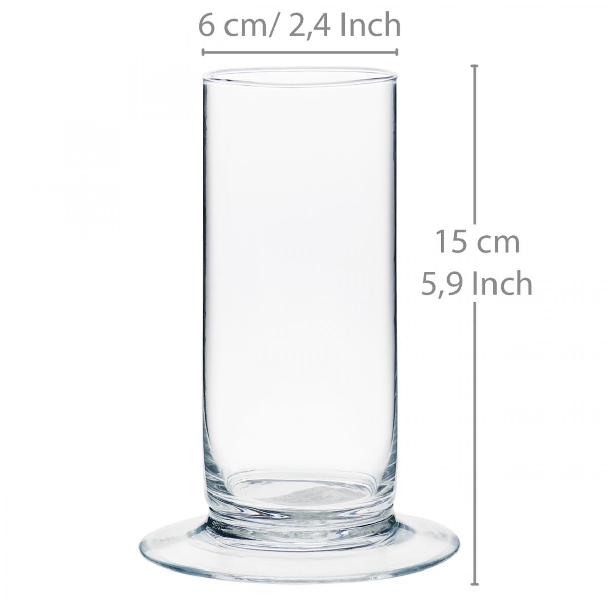 Der klare Glas-Zylinder mit Fuß ist etwa 15 Zentimeter hoch. Der Durchmesser der Vase selbst beträgt circa 6 Zentimeter.