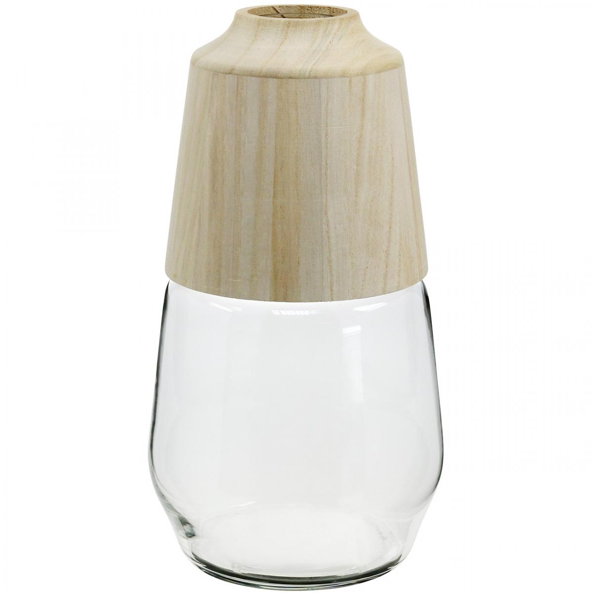 Produktname: Glasvase mit Holz Deko Vase Blumenvase Klar H30cm