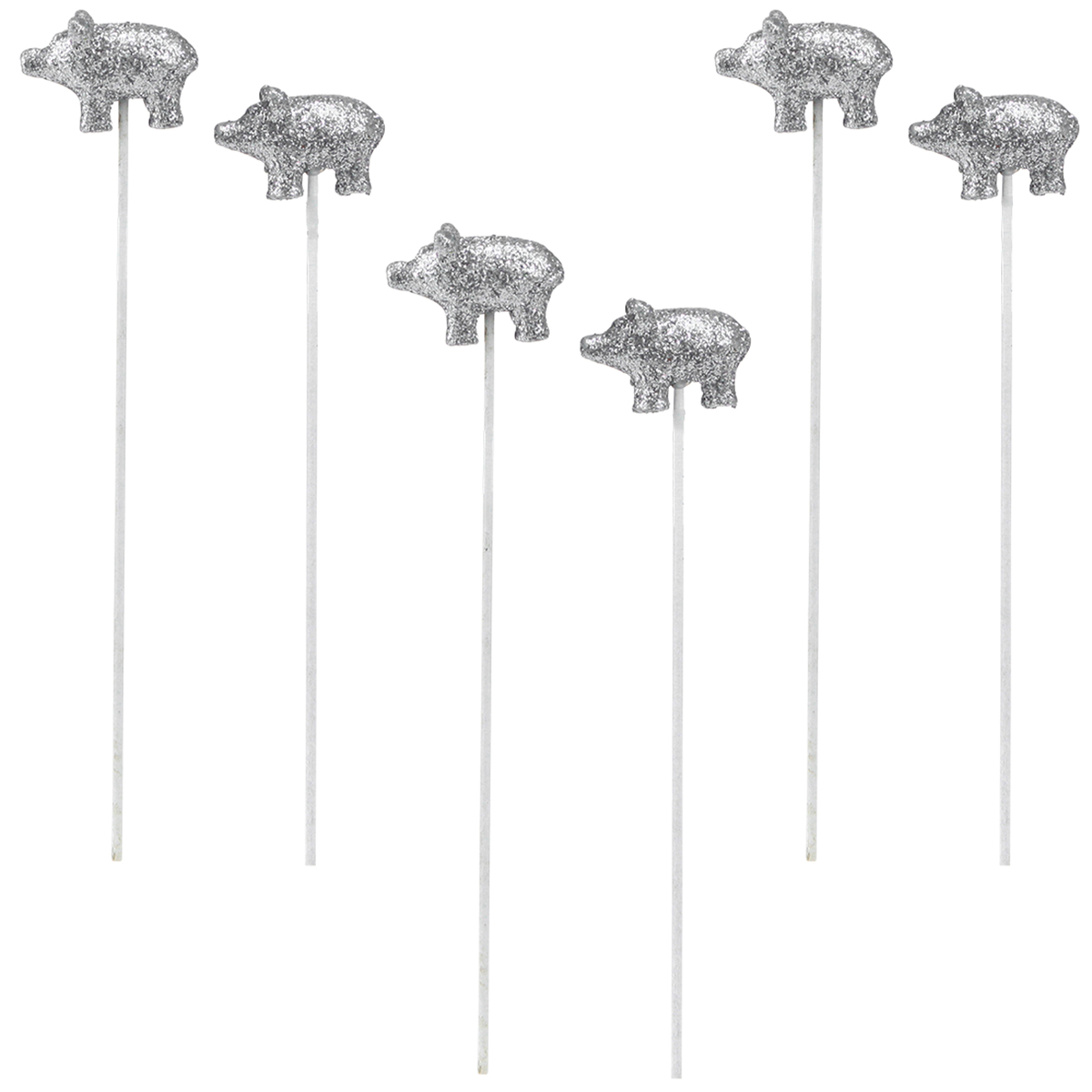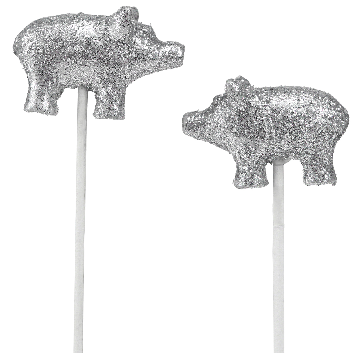 Glücksschwein Silvester Glücksbringer am Stab Silbern 3cm 6St