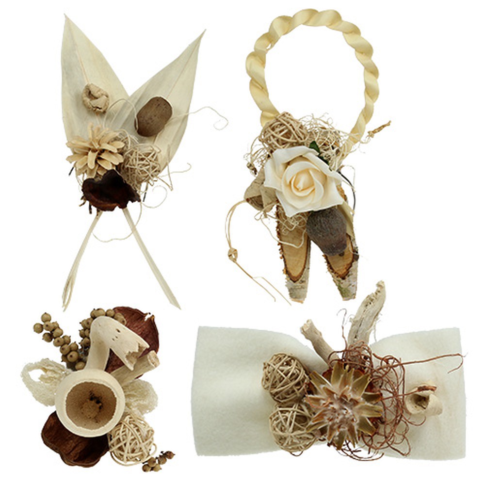 Besonders praktisch ist, dass jede Grabauflage einen langen und stabilen Steckdraht an der Unterseite befestigt hat, mit dem Sie die Naturdeko in Unterlagen wie Moos, einem Styroporkreuz oder einem Strohkranz einarbeiten können. Sie können dabei auch zwischen den 4 verschiedenen Gesteckvarianten aus diesem Mix wählen, um damit eine Grabdekoration ganz individuell gestalten zu können. Auch können Sie mit den kleinen Grabauflagen Tischdekorationen für die Trauerfeier kreieren und diese auch an einen Tischkranz mit Kerzen heften.