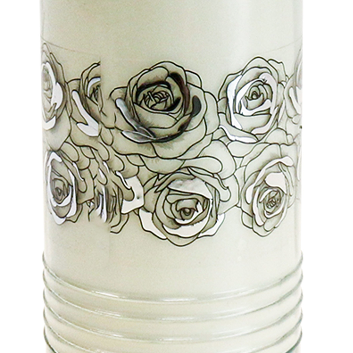 Die Grabkerzen in Weiß sind anmutig mit einer silbernen Bordüre aus Rosen geschmückt. Ein Deckel schützt die Grabkerze vor Nässe und Regen.