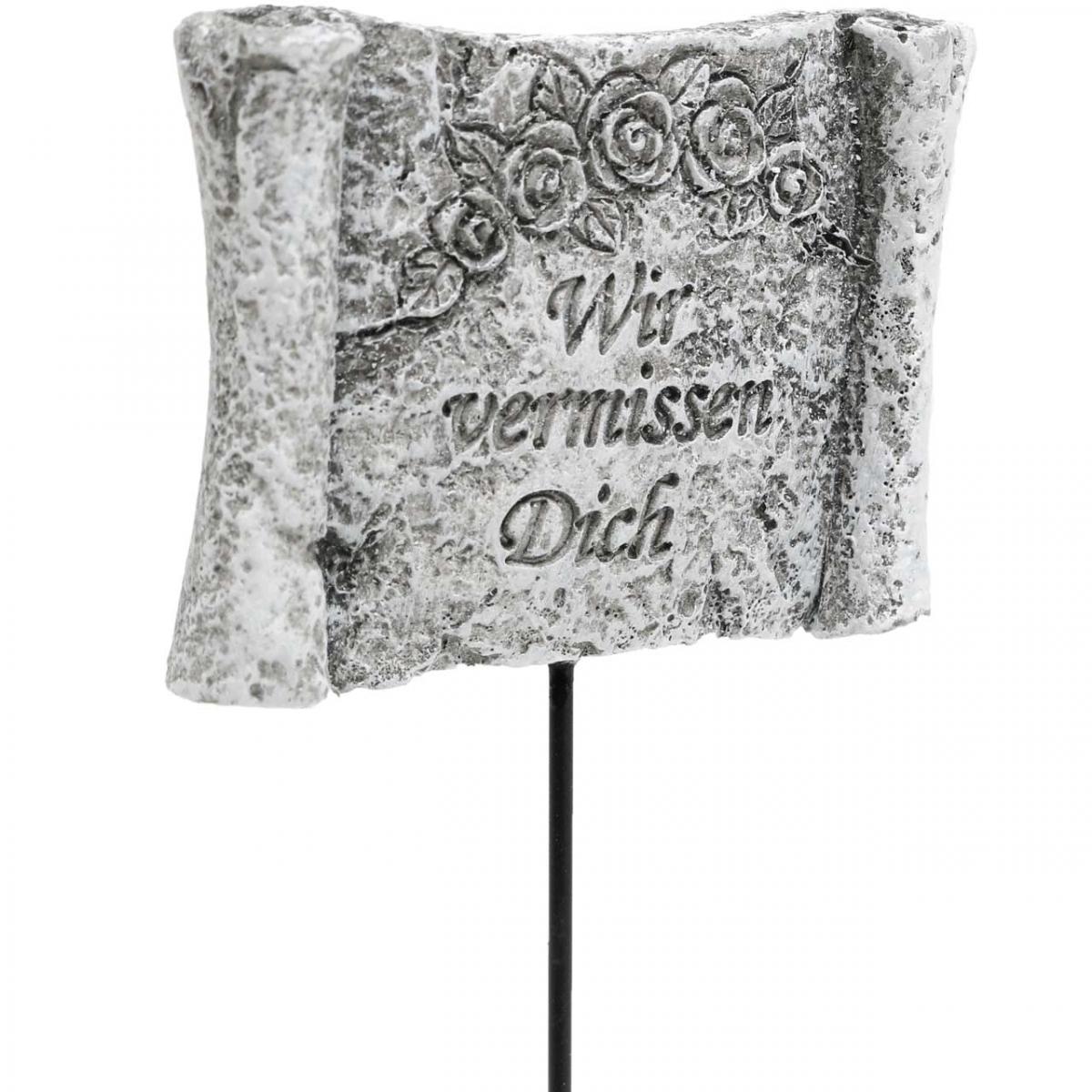 Je zwei der wie eine Steintafel gestalteten Dekostecker mit Spruch tragen die eingravierte kursive Aufschrift „In stillem Gedenken“, „Für immer im Herzen“ und „Wir vermissen Dich“. Jede der Tafeln ist an den Rändern ein Stück wie ein Pergament eingerollt. An der Oberseite ist jedes Schild der Blumenstecker mit einem Bogen aus Rosen verziert.