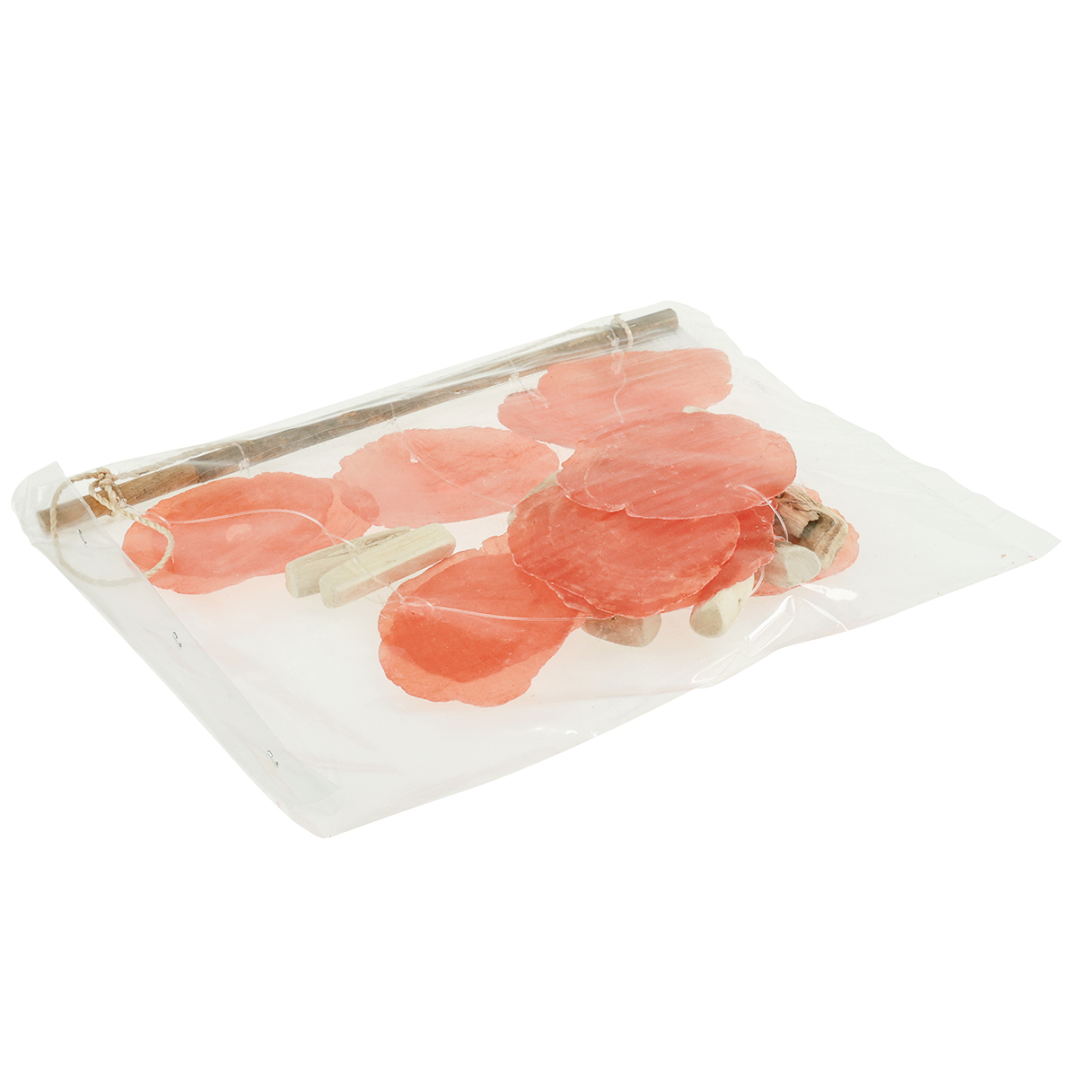 Das Rundholz selbst ist mit einer Schnur aus Naturfasern versehen, die die Aufhängung darstellt. Bis auf die transparenten Nylonfäden, die die Muschel-Deko halten, besteht diese maritime Deko somit aus Natur pur!