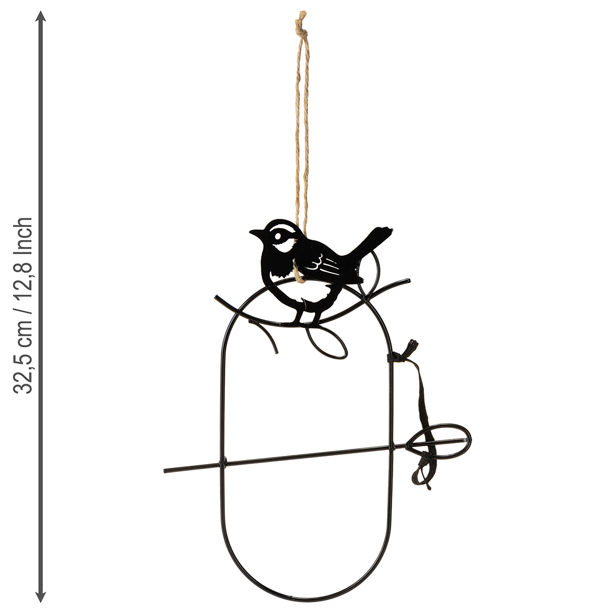 Die Deko-Vögel sitzen auf einem ovalen Ring, der von einem ebenfalls schwarzen Metallstab geteilt wird. Der Stab ist bei dieser Hängedeko an einem Gummiband befestigt. So lässt er sich praktisch herausnehmen, um einzelne Deko-Elemente wie Gräser oder kleine Hänger aus Holz einzuhängen. Auch Vogelfutter wie einen Apfel können Sie am Stab anbringen und die Metalldeko dann an einem vor Regen und Katzen geschützten Ort auf der Terrasse oder dem Balkon aufhängen.