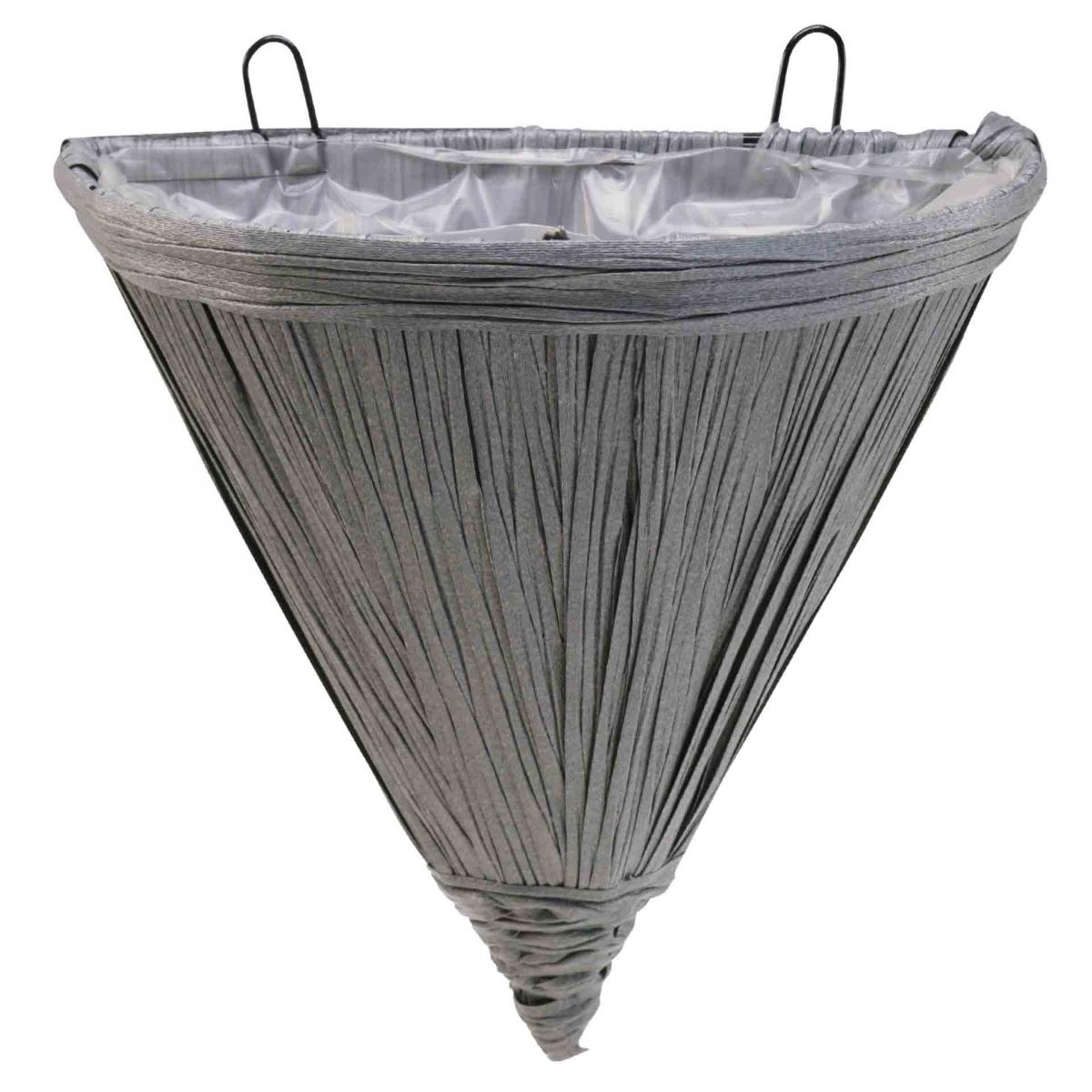 Die Wandampel besteht aus einem stabilen Metallgerüst, das die Form eines spitz zulaufenden Halbkegels besitzt. Der Pflanzkorb ist aus breiten, flexiblen sowie robusten Kunststoffbändern geflochten.