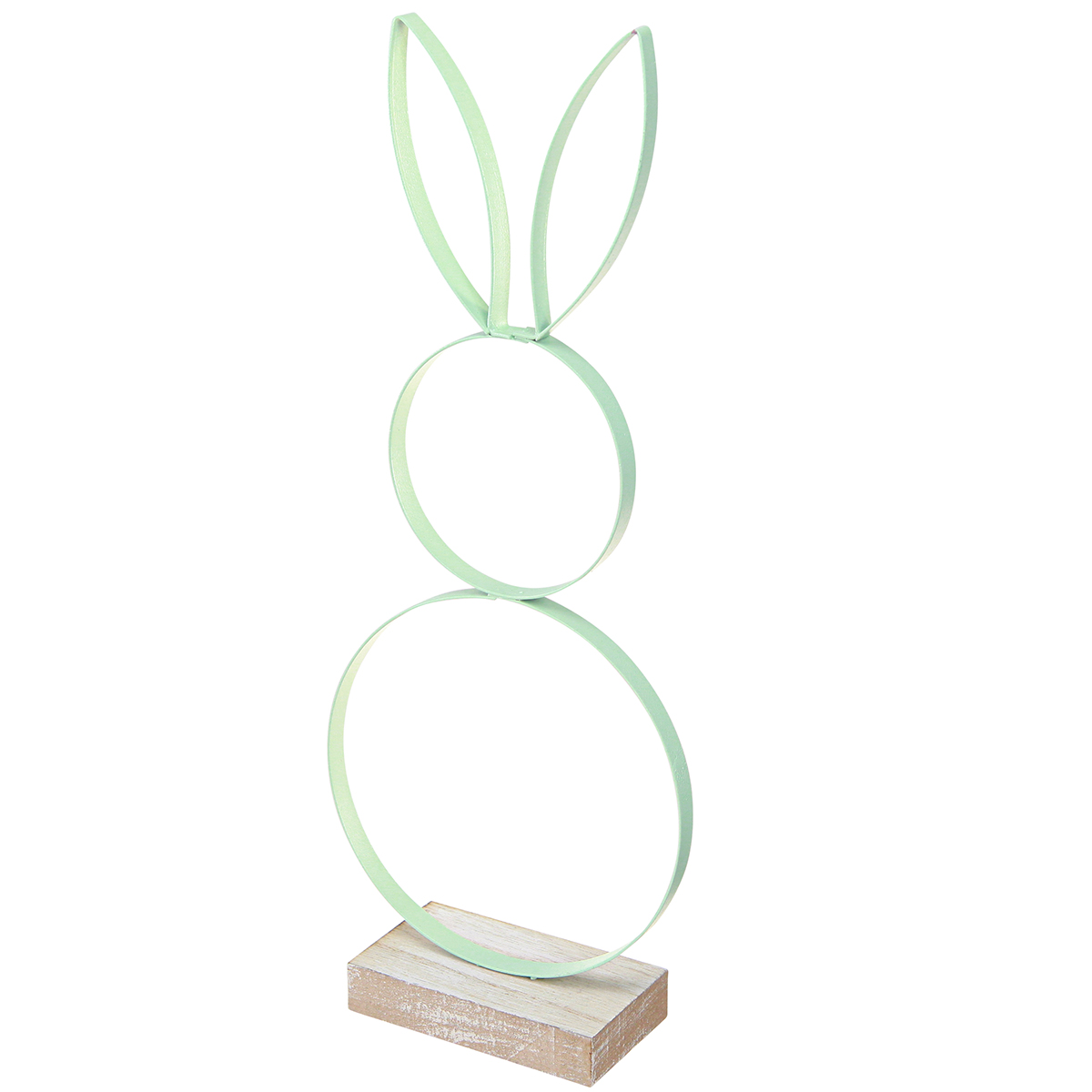 Farbenfrohe Hasen-Deko aus Metall auf Holz-Sockel in Natur: Ein Frühlingshighlight in Mint, Gelb und Rosa