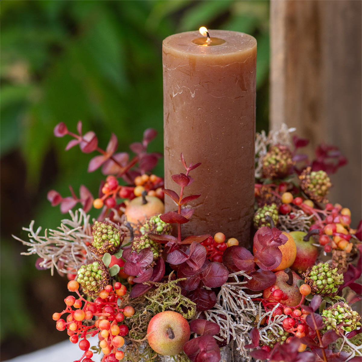 Wunderschöne Kontraste schaffen Sie, indem Sie den Herbstzweig mit Seidenblumen in Orange und Creme zum Strauß binden. Ein Kranz mit künstlichem Eucalyptus und weißen Trockenblumen als Kunstblumen wird zum unwiderstehlichen Wandschmuck für den Herbst. Wenn dann Weihnachten näher rückt, können Sie das Arrangement mit dem roten Dekozweig durch einige goldene Kugeln variieren und so den künstlichen Eukalyptuszweig gleich zur Weihnachtsdeko machen.