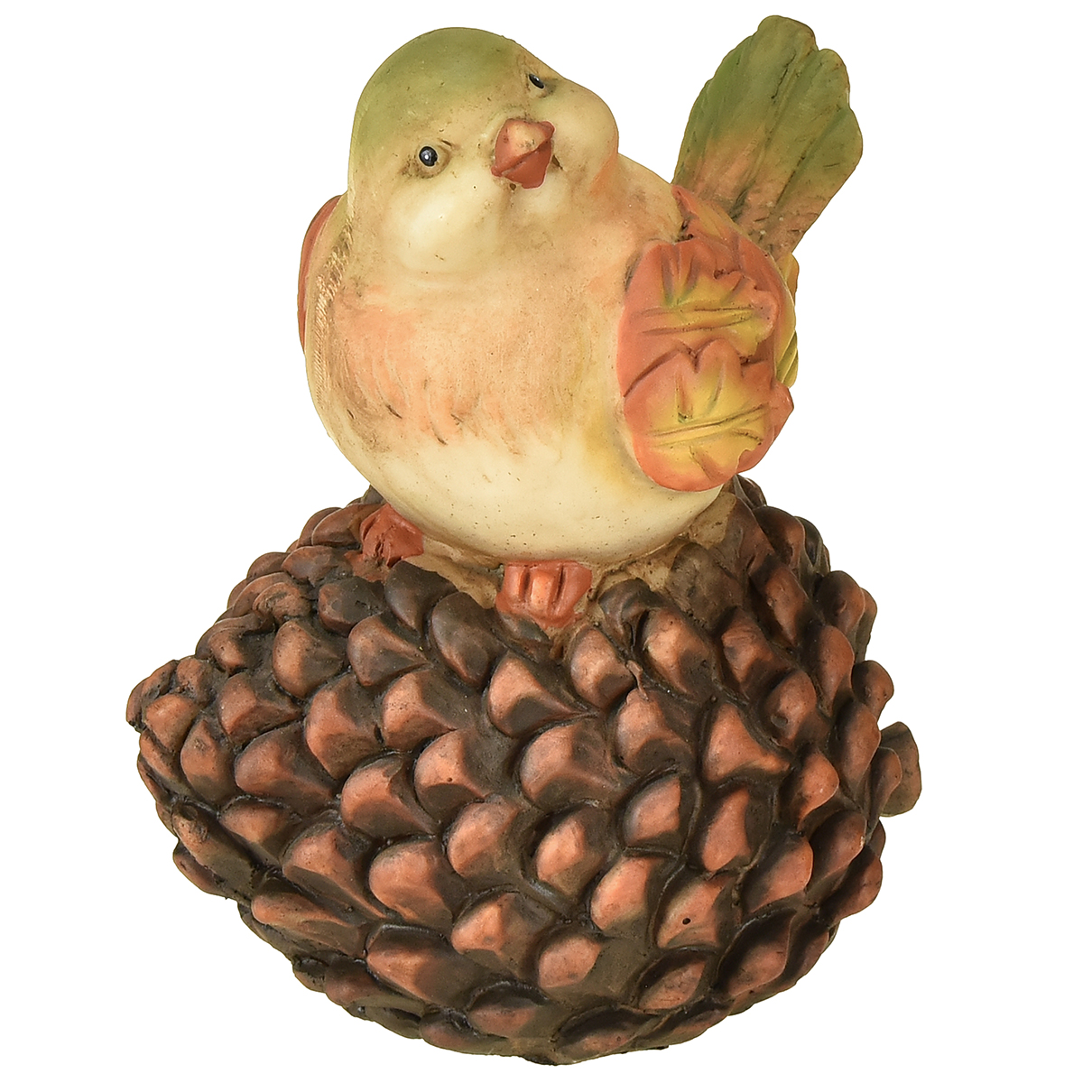 Bei dieser ausgefallenen Herbstdeko hat es sich eine große Vogelfigur direkt auf dem künstlichen Dekozapfen gemütlich gemacht. Aufmerksam schaut der Herbstvogel mit leicht geneigtem Kopf zu seinem Betrachter.
