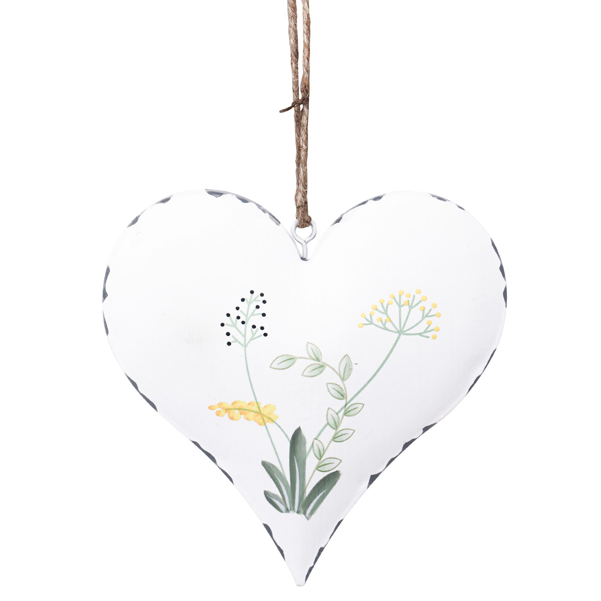 Aufhängen können Sie die weißen Metallherzen mit Blumenmuster an der bereits angebrachten Kordel aus Naturfasern. Auch diese Komponente sowie die künstlichen Abriebspuren, die Sie an den Rändern entdecken werden, unterstreichen den nostalgischen Charme der Vintage-Deko.