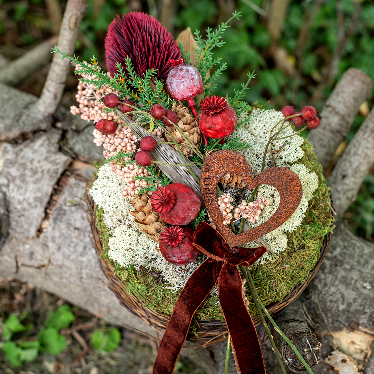 Brandgefahr: Leicht entflammbare Materialien wie Trockenblumen, Moos, Kerzen, Kunststoff oder Schleifen können bei Kontakt mit offenem Feuer brennen.