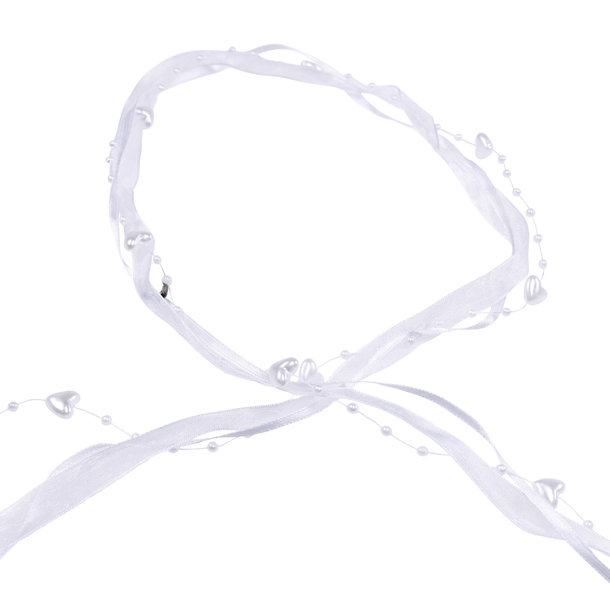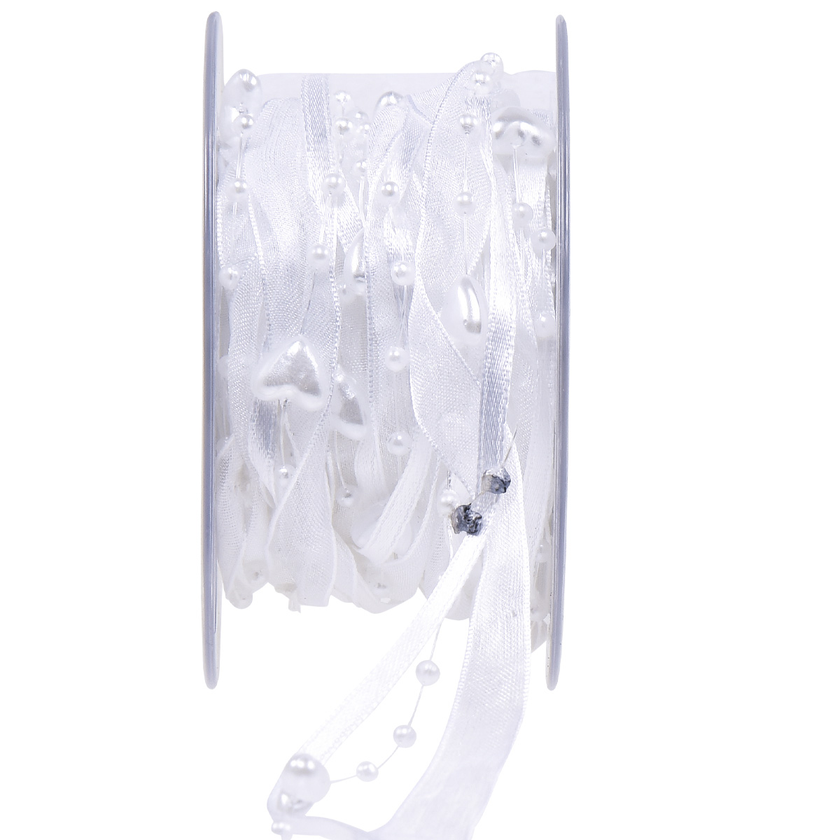 Das zarte Hochzeitsband besteht aus schimmerndem, halb transparentem Organza-Stoff. Darauf sind ein schmaleres Band und eine Schnur mit Herzen und kleinen Perlen angebracht. In der Hochzeitsdeko entsteht so ein sehr raffinierter Effekt.