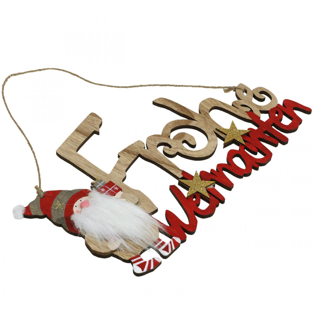 Nutzen Sie die Weihnachtsdeko zum Aufhängen als fröhliche Fensterdeko. Hängen Sie den Schriftzug Frohe Weihnachten mit der angebrachten Jutekordel ins Fenster, an die Wand oder an die Türe.