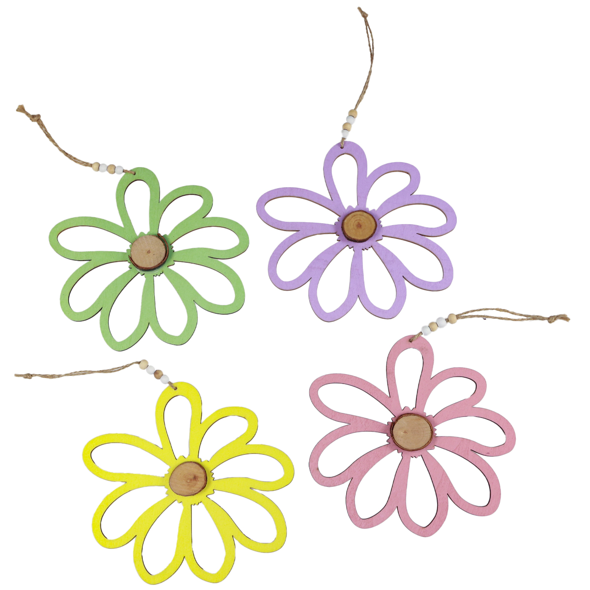 Der Beutel beinhaltet vier Holzblumen in den Farben Gelb, Grün, Lila und Rosa – ein echter Blumentraum in Pastell, den Sie zu Ostern mit Figuren wie Hasen oder anderen Aufhängern aus unserem Shop ausgestalten können.
