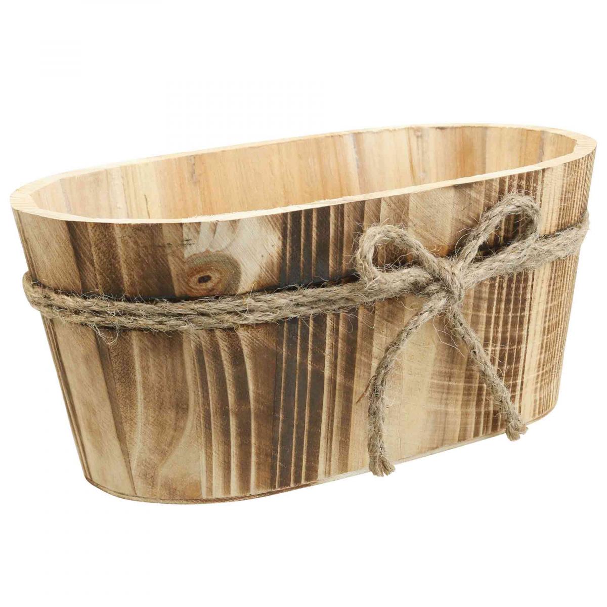 Der Landhausstil und die Natürlichkeit der Holzschale werden auch durch die in das Holz eingelassene doppelte Jutekordel mit der schönen Schleife unterstrichen. Innen ist die rustikale Deko komplett unbehandelt. Wenn Sie die Schale mit Folie auskleiden, kann sie als Pflanztopf oder ovaler Übertopf für lebende Blumen dienen.