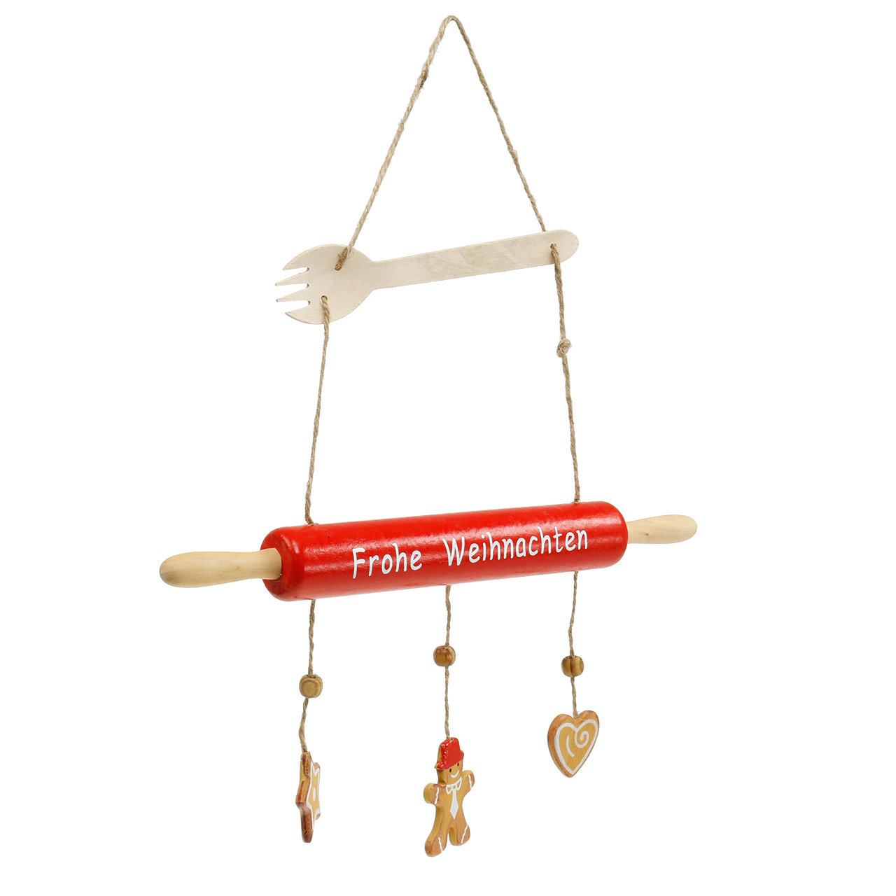 Die Holzgabel befindet sich im weihnachtlichen Back-Arrangement zum Hängen ganz oben, mit etwas Abstand folgt das hölzerne Nudelholz, darunter ein Sternplätzchen, ein Lebkuchenmann und ein Keks in Herzform, abgetrennt durch eine kleine Holzperle.