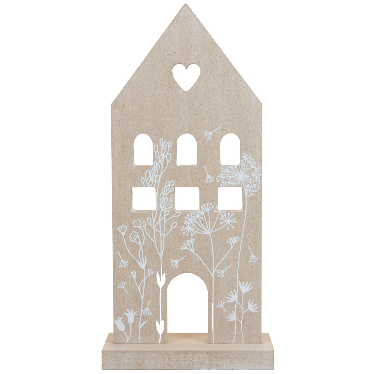 Das schmale Deko-Haus aus MDF-Holz hat einen flachen, breiteren Fuß, womit der Aufsteller auf dem Tisch oder Fensterbrett stabil und sicher steht.