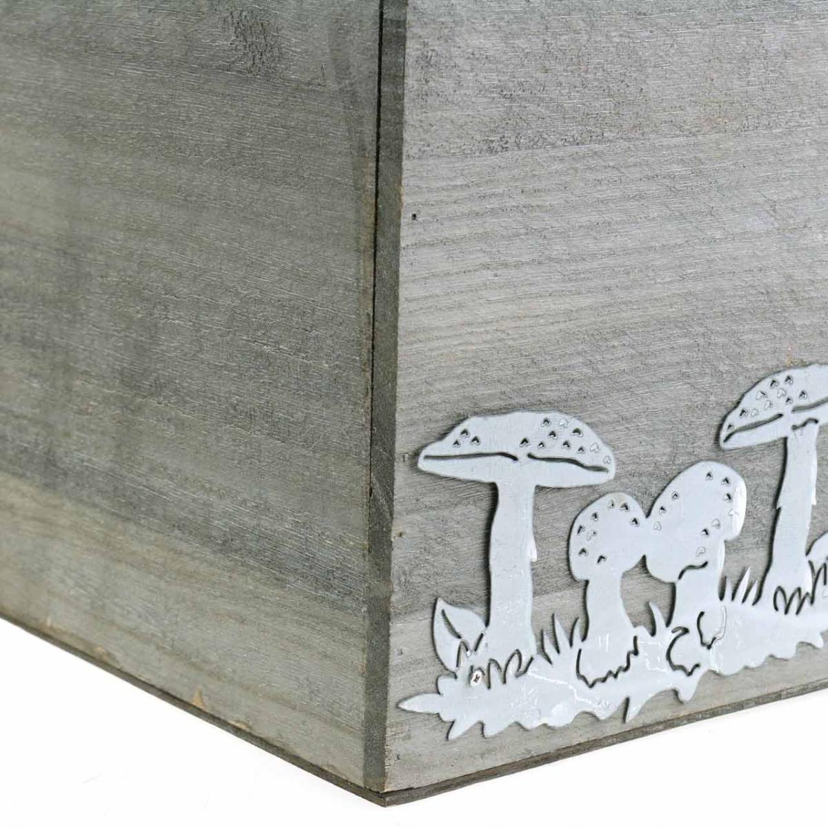 Jede Blumenkiste des Holzkasten-Sets ist bereits mit Pflanzfolie ausgelegt und an der Außenseite mit unterschiedlichen Pilz-Applikationen aus Metall verziert. Diese silberne Pilzdeko ist jeweils Weiß gewaschen, was ihr einen ansprechenden Vintage-Charme verleiht.