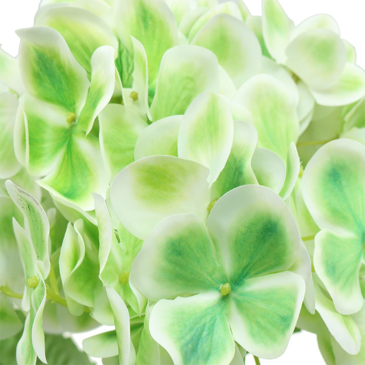 Die künstliche Hortensie in Grün und Weiß hat eine Länge von etwa 68 Zentimetern, wobei der Durchmesser des Blütenkopfes circa 15 Zentimeter beträgt. Sie besteht vollständig aus Kunststoff beziehungsweise Seidenstoff und weist zusätzlich einen Drahtkern auf.