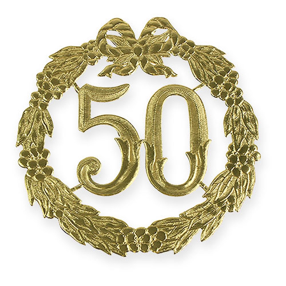 Diese Jubiläumszahl „50“ in Gold ist ein wundervolles Dekoelement für die Goldene Hochzeit! Hängen Sie die Dekozahl über die Eingangstür des Paares oder aber über den Eingang zum Veranstaltungsraum. Außerdem können Sie vielfältige Wanddekorationen für die Feier gestalten: Wie wäre es zum Beispiel mit einer Girlande mit dem Jubiläumskranz als Mittelpunkt?