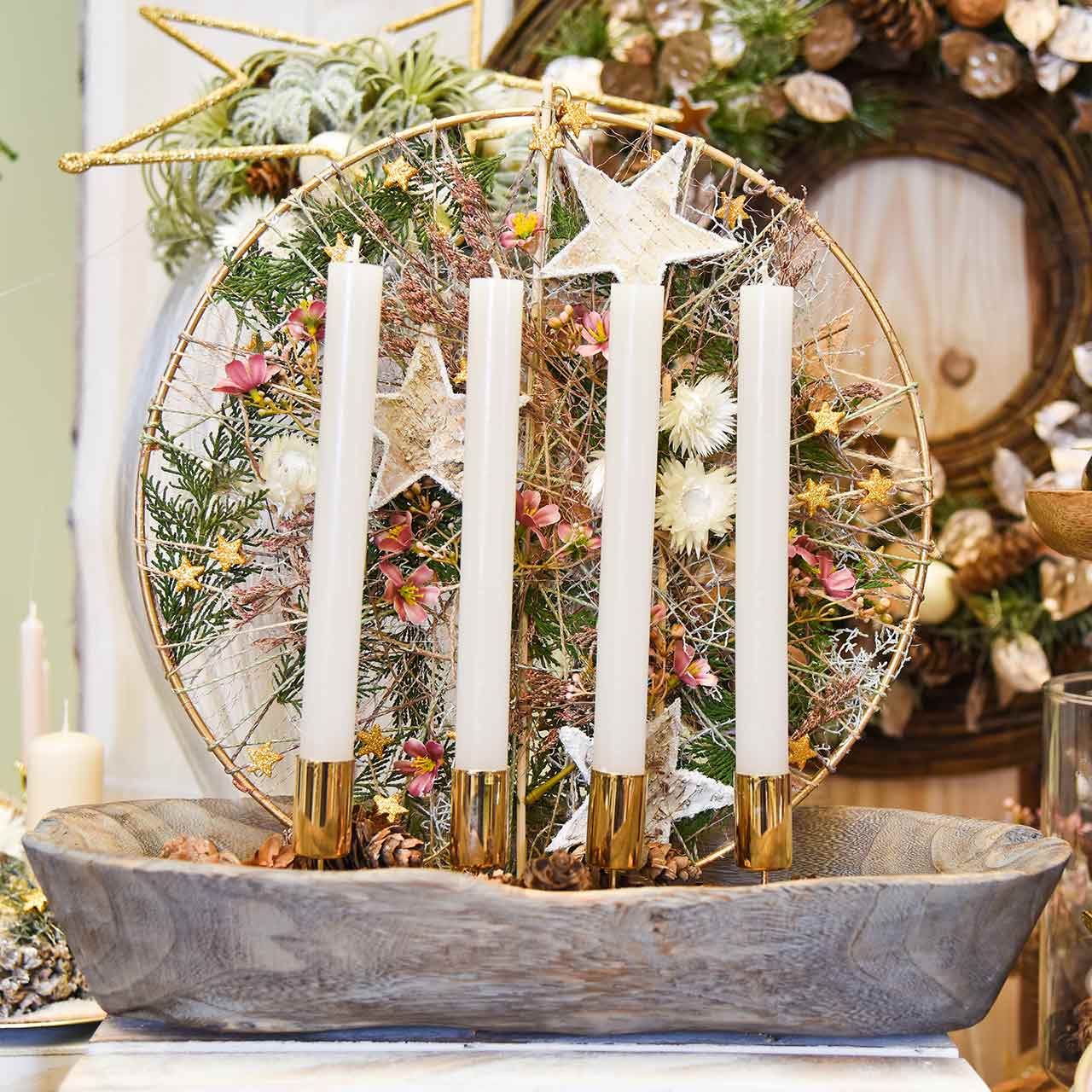 Ob in Steckschaum oder Styropor eingearbeitet, mit den Kerzenhaltern können Sie somit Ihren individuellen und edlen Adventskranz oder Ihr Adventsgesteck gestalten. Bestücken Sie Ihren Kranz mit frischem Tannengrün, kleinen Tannenzapfen und edlen Nüssen und runden Sie das Dekorationsstück mit den edlen und festlich anmutenden Kerzenhaltern ab. Das zeitlose und klassische Design macht die Kerzenhalter auch über das ganze Jahr verteilt zu einem schönen Dekorationsstück. So können sie beispielsweise ein mit Dekogranulat befülltes Glas mit dem Kerzenhalter bestücken und es als Tischdekoration verwenden oder es auf ein Sideboard platzieren.