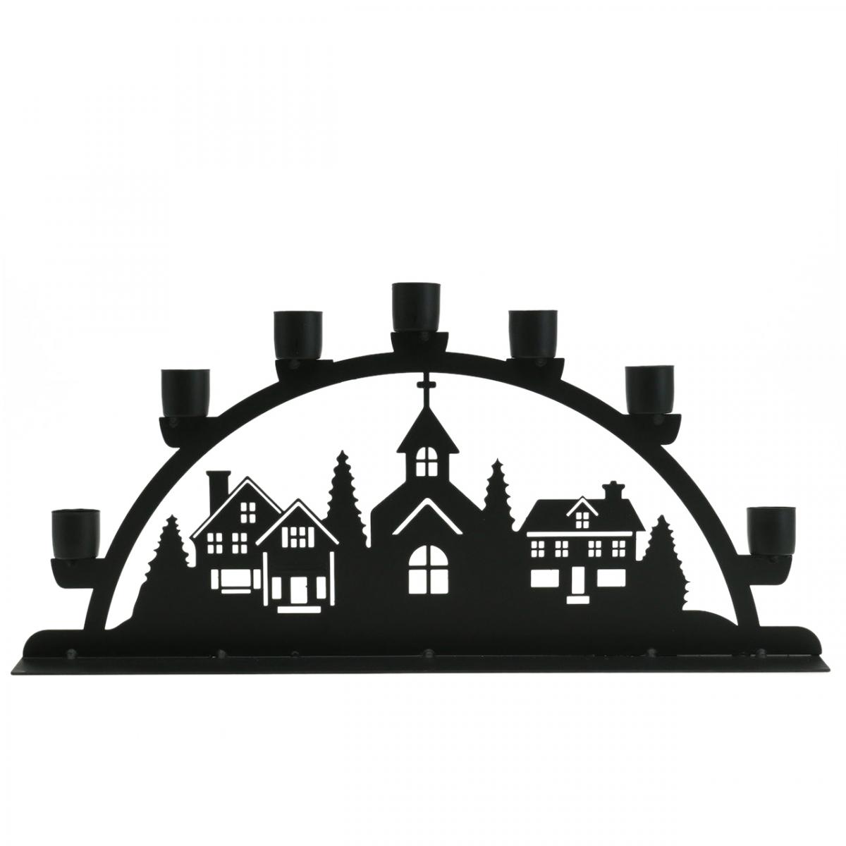 Die beliebte Weihnachtsdekoration enthält die Silhouette szenischer Darstellungen, welche mit dem Licht der Kerzen besonders beeindruckend wirken. Dieser modern gestaltete Schwibbogen ist schwarz lackiert und zeigt eine Szenerie aus Häusern und Bäumen, die um ein christliches Kirchengebäude stehen. Die fein eingearbeiteten Aussparungen am Metall zeigen feine Details wie Fenster, Türen und Dächer. Durch das Flackern der Kerzen wird das Dorf lebendig.